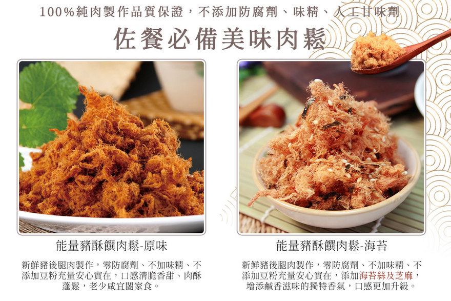 嚴選安心肉品,選用高品質能量豬肉品製作零防腐劑、不加味精、不添加豆粉充量安心實在豬肉纖維絲絲明顯,入口鬆脆口感佳獨家黃金比例調配,香氣、口感更升級各式料理搭配皆宜,是小朋友、長輩三餐搭配好選擇選自高品質能量豬,飼育過程絕不使用抗生素、賀爾蒙,無藥殘留。100%使用極品能量豬純豬肉精製,零防腐劑、不加味精、不添加豆粉充量,顛覆您對肉鬆的味覺記憶,給您前所未有的清脆口感。當豬肉纖維在口中應聲斷裂, 您將同時感受到味覺與聽覺的頂級享受,創造您對肉鬆的全新味覺印象。