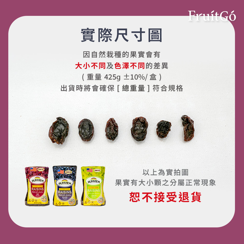 — Califonia Sunview Jumbo Raisin —美國原裝進口,100%天然,無人工色素與其他添加物比一般市售大2倍的葡萄乾,果肉多、果汁多、口感好!產地|美國加州重量|每罐 425克 效期|紅無籽葡萄乾 2027/04/16 黑無籽葡萄乾 2027/04/17 綠無籽葡萄乾 2027/04/15
