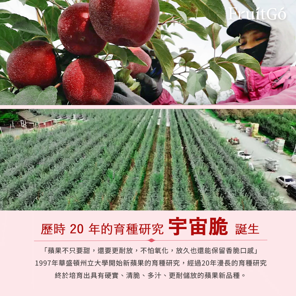 「蘋果不只要甜,還要更耐放,不怕氧化,放久也還能保留香脆口感」1997 年華盛頓州立大學開始新蘋果的育種研究,經過 20 年漫長的育種研究,終於培育出具有硬實、清脆、多汁、更耐儲放的蘋果新品種。目前只有華盛頓州的農民可以栽種,種植面積有6000畝,共有1200萬顆蘋果樹的產量。天然酸甜 香脆多汁「宇宙脆」(Cosmic Crisp),因果皮上有類星星的小點而得名,也因它的脆度得名,它的名字很直接的表明了它的特性。保留蘋果特有微酸風味的「宇宙脆」,入口後偏酸、甜而不膩、酸甜比例絕佳;還能長期存放,削皮後果肉置於空氣中也不會變色。一推出即掀起全美搶購風潮!