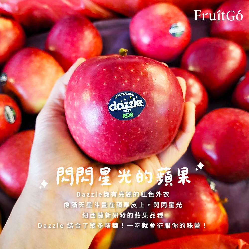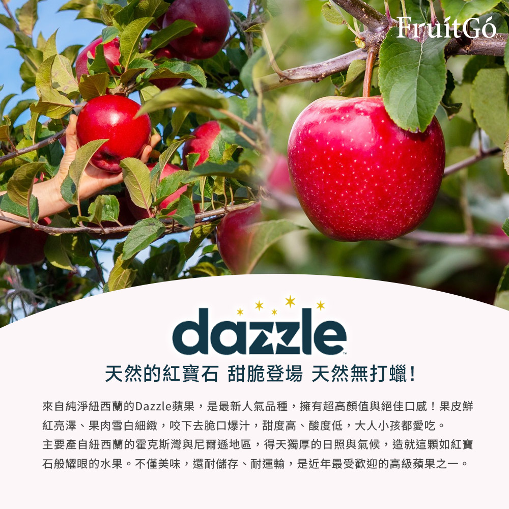 Dazzle起源於天然純淨的紐西蘭,種植於紐西蘭北島東海岸Hawks Bay (霍克灣)。經過20年的發展和創新,而成果型大且紅,多汁且脆,甜度高,幾乎零酸度的美味蘋果。