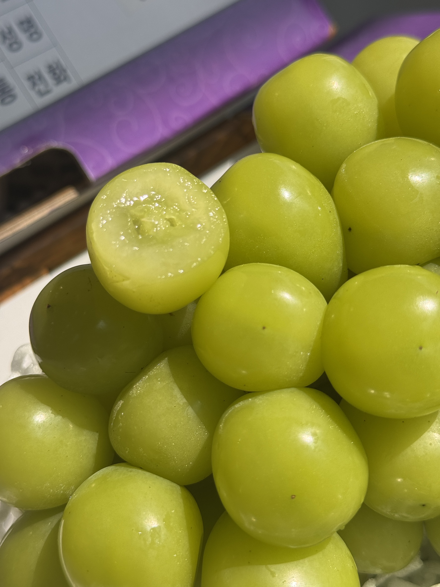 ✈️ 韓國進口,新鮮直達,品質看得見🍭 糖度高、甜美爽口,一口爆汁超療癒💚 翠綠晶瑩外觀,每顆都飽滿圓潤,顏值超吸睛🍇 果肉Q彈有蜜香,像在吃QQ水果軟糖🎁 無籽設計超方便,大人小孩都愛吃
