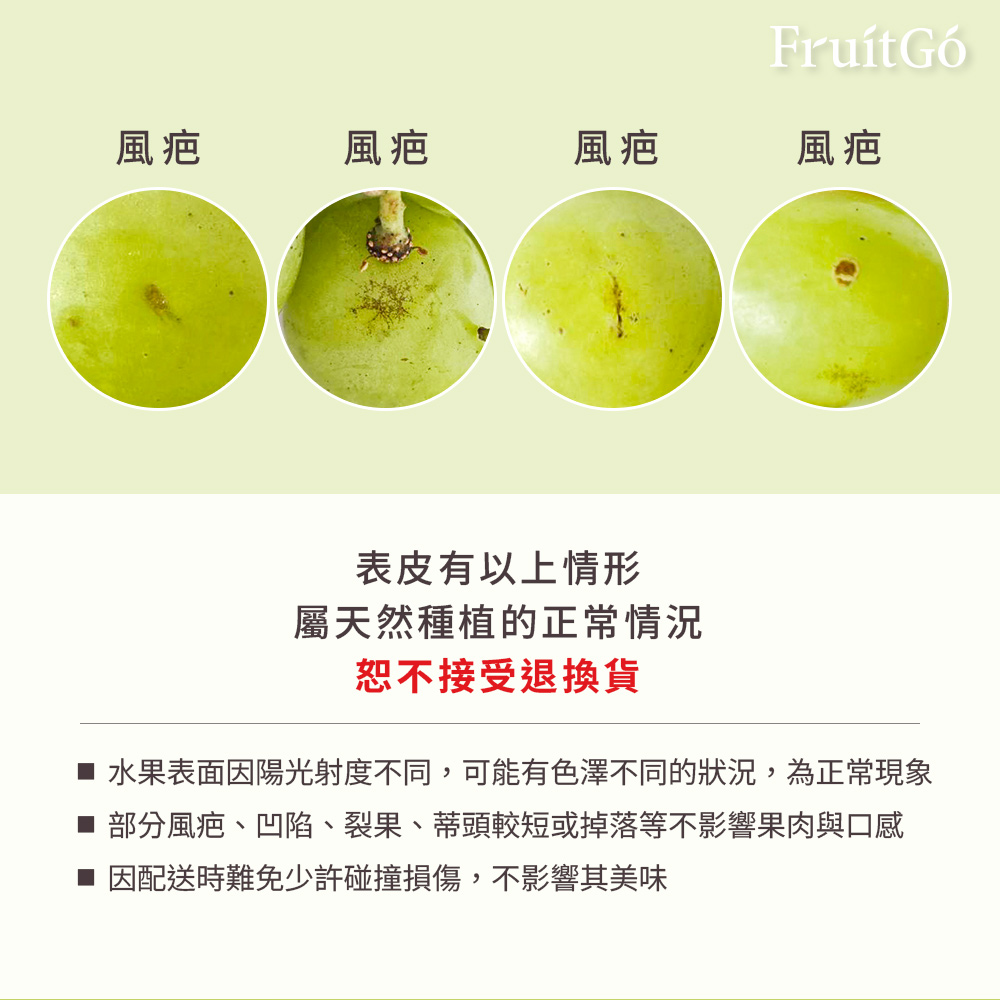 小提醒:❶ 天然栽種之新鮮水果蔬菜會有些許大小顆差異,馥果出貨時會確保總重量符合商品規格。❷ 葡萄會有運輸時產生的輕微痕跡 ( 如:落果等),並不影響實際口感喔!❸ 進口原箱商品為不拆售直接出貨,運送過程約有5%的耗損為正常現象,恕不在退換貨範圍。❹ 外箱為示意圖,出貨品牌及外箱包裝以當次到貨為準。