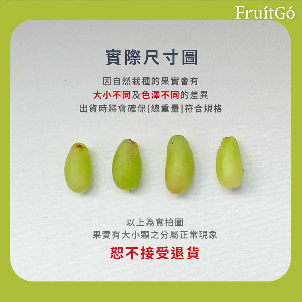 位於中高海拔的葡萄果園馥果精選位於高海拔的葡萄果園,位於山坡上、氣候較溫和的地區。種植於健康富饒、排水性良好的沙土,因此產出的葡萄新鮮、Q彈!價格實惠,不太甜的無籽葡萄◎ 果身為漂亮的長橢圓型◎ 果皮薄、果肉Q彈◎ 甜中帶酸,推薦給喜歡半糖的朋友!小提醒:❶ 天然栽種之新鮮水果蔬菜會有些許大小顆差異,馥果出貨時會確保總重量符合商品規格。❷ 葡萄會有運輸時產生的輕微痕跡 ( 如:落果等),並不影響實際口感喔!❸ 進口原箱商品為不拆售直接出貨,運送過程約有5%的耗損為正常現象,恕不在退換貨範圍。❹ 外箱為示意圖,出貨品牌及外箱包裝以當次到貨為準。
