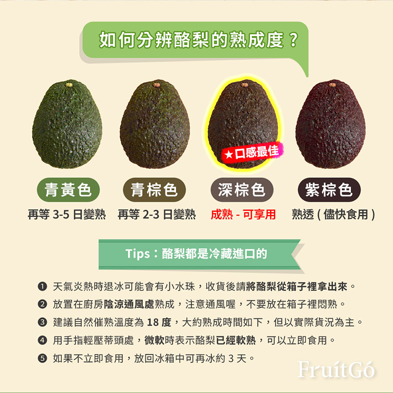 ❷ 放置在廚房陰涼通風處熟成,注意通風喔,不要放在箱子裡悶熟。❸ 建議自然催熟溫度為18度,大約熟成時間如下,但以實際貨況為主。美國酪梨:3-5月約5-7天,6-7月約2-4天紐西蘭酪梨:6-10月約5-7天,11-2月約2-4天❹ 如何知道已催熟?用手指輕壓蒂頭處,微軟時表示酪梨已經軟熟,可以立即食用。❺ 如果不立即食用,放回冰箱中可再冰約 3 天。