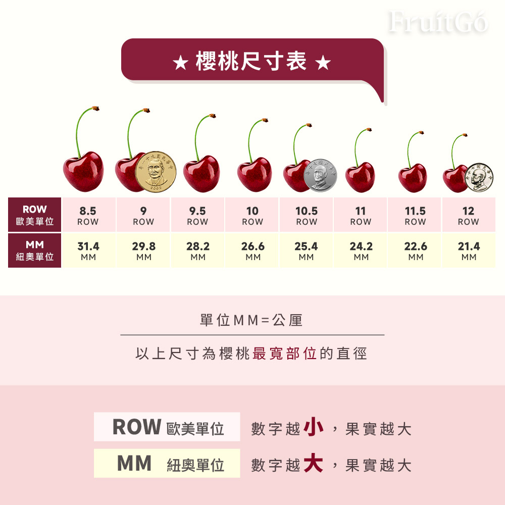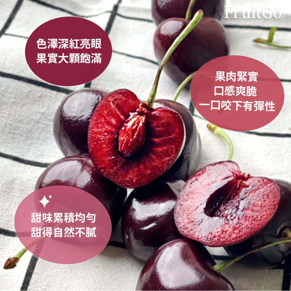 商品特色南半球盛夏產季,新鮮正當時 12–1 月採收,正好在台灣冬季,最新鮮的櫻桃到貨。氣候涼爽,甜得自然不膩 成熟速度慢,甜味累積均勻,口感清甜、風味純淨。果實大顆,外型亮眼 果形飽滿、色澤深紅,很適合送禮與高端市場。果肉緊實,口感爽脆 一口咬下有彈性,吃得到新鮮櫻桃的清脆感。環境純淨,吃得安心遠離工業污染,出口規範嚴謹,品質與安全備受信賴。