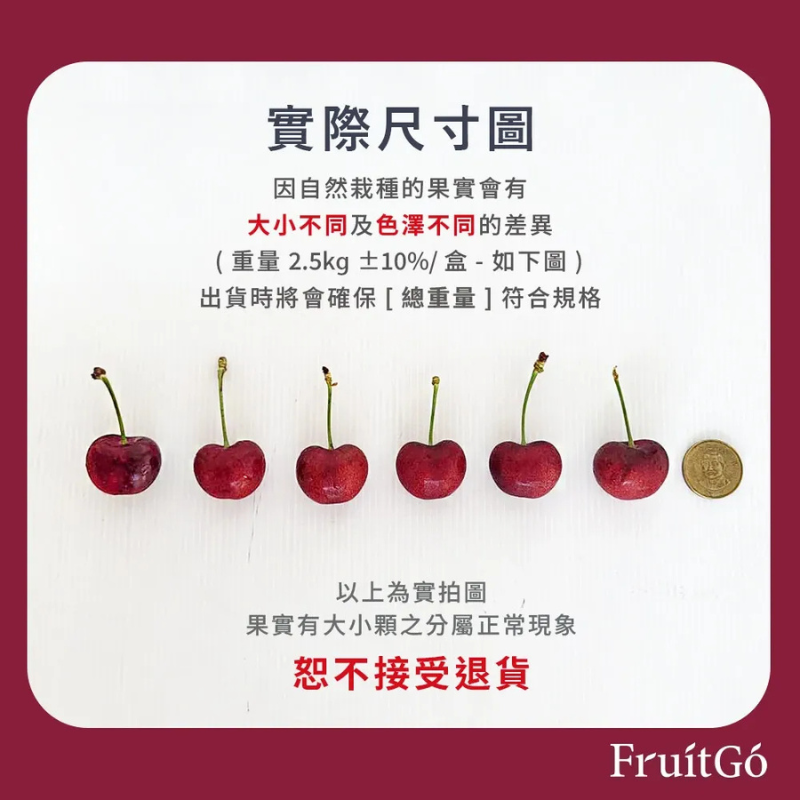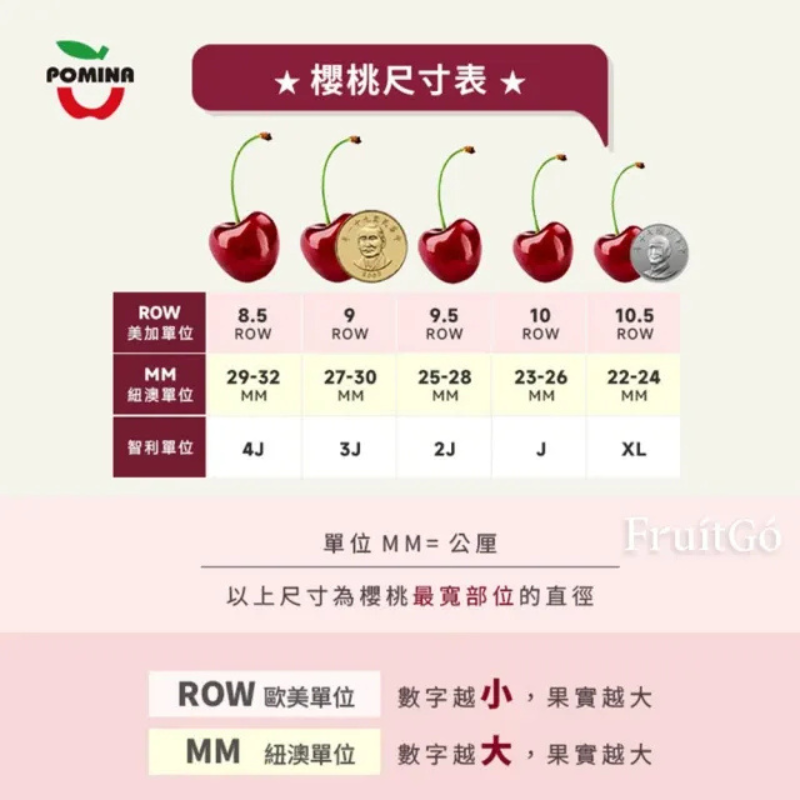 櫻桃尺寸看這裡智利櫻桃的尺寸單位與美國櫻桃不同,會使用不同的代稱。馥果精選大顆及特大顆尺寸櫻桃,吃起來口感爽脆!*中大,約為28mm*大顆,約為30mm*特大顆,約為50元硬幣大小,直徑約32mm