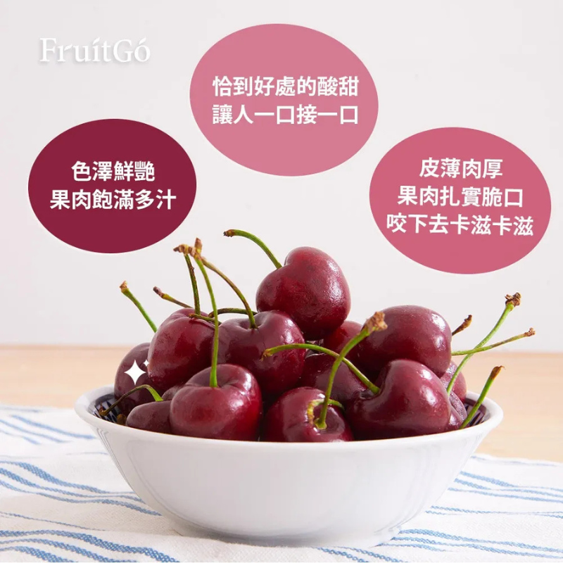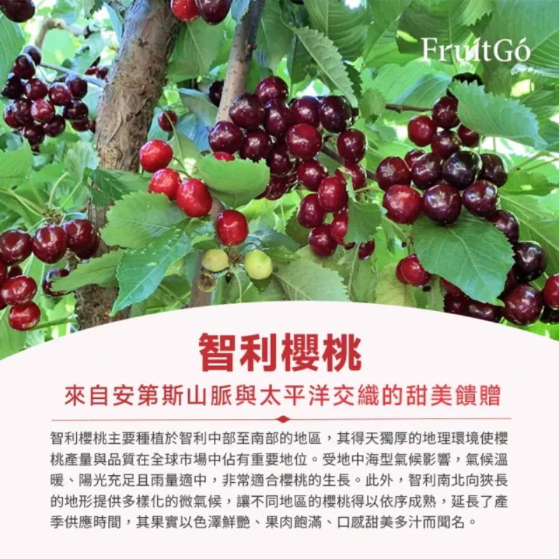 品質、品質、品質!買櫻桃最怕買到不好吃的!市面上有櫻桃品種多到數不清,每個品種的櫻桃味都有些不同。重點來了!!!"對的時間點吃對的品種"色澤艷麗,果實光滑碩大,皮薄肉厚!櫻桃香甜多汁的果肉,又帶點微微的酸味,恰到好處的完美搭配,讓櫻桃成為水果禮盒的最佳選擇。酸酸甜甜多汁的櫻桃,讓人一口接一口,回味無窮。智利屬於地中海型氣候,具有乾燥、少雨、日夜溫差大的特性,擁有肥沃且排水良好的河谷地形及純淨豐沛的灌溉水,加上智利的農業科技發達,有非常適合櫻桃生長的天然環境,因此生長的櫻桃十分美味!◎果實光滑碩大,色澤漂亮。◎果肉扎實脆口,汁多肉厚!咬下去卡滋卡滋!◎櫻桃味豐富,幸福的滋味!