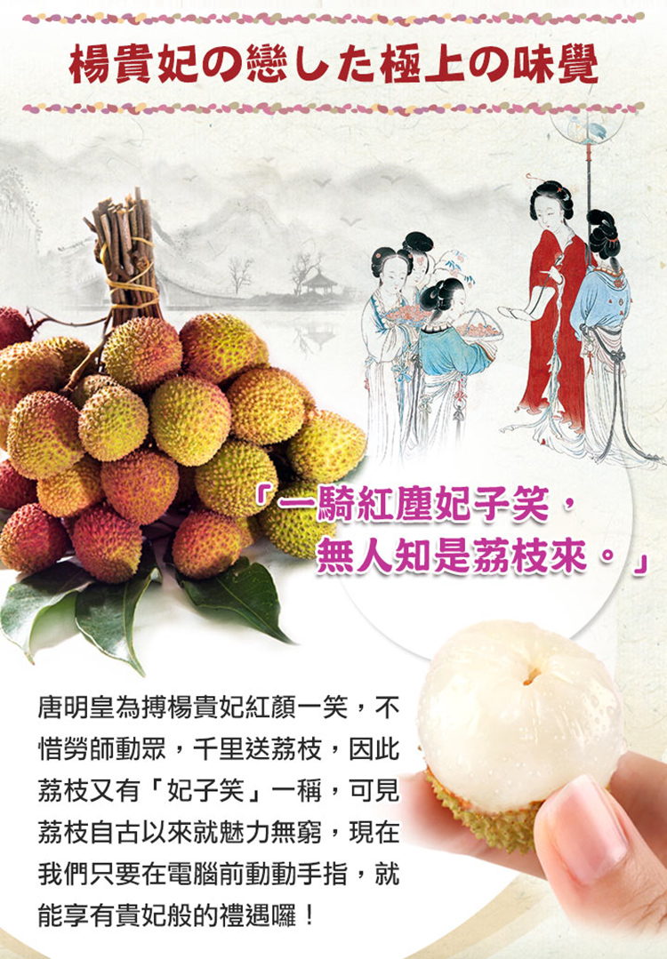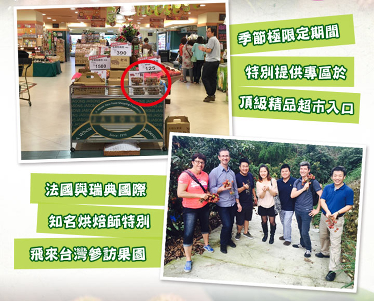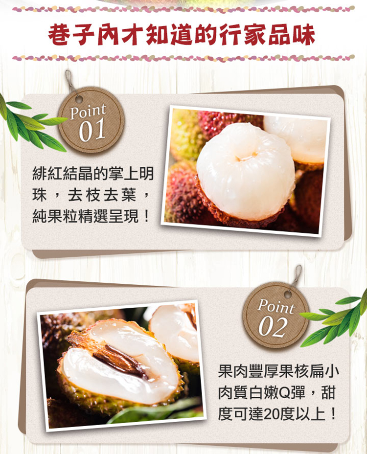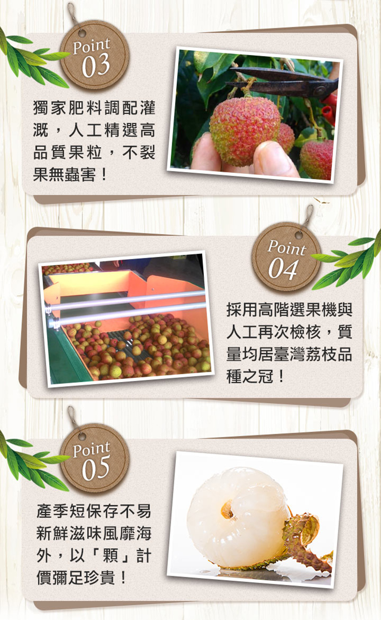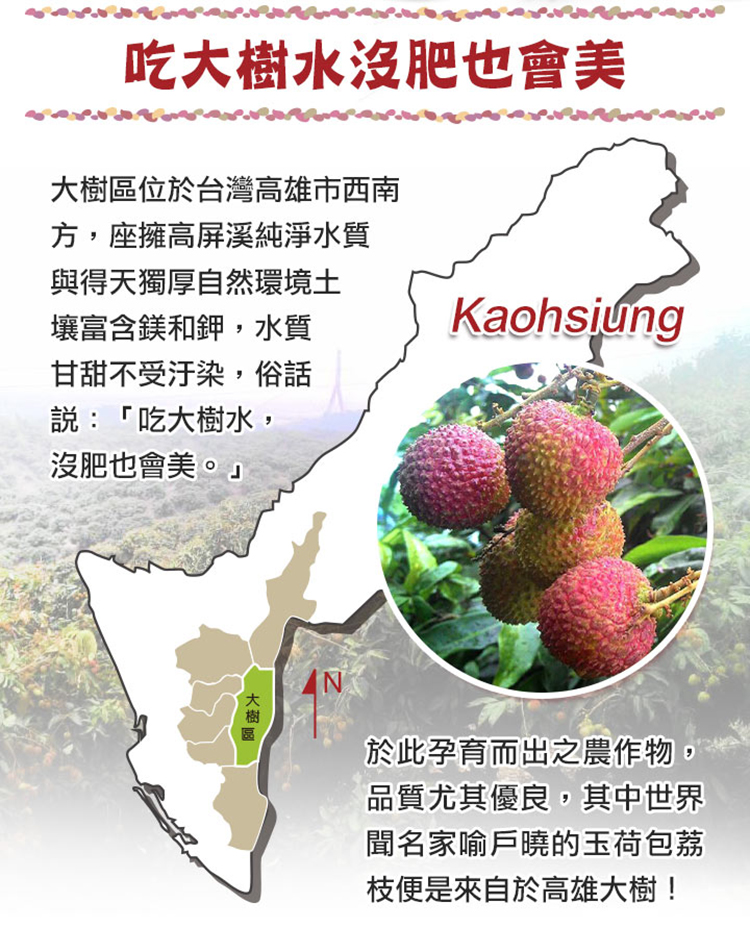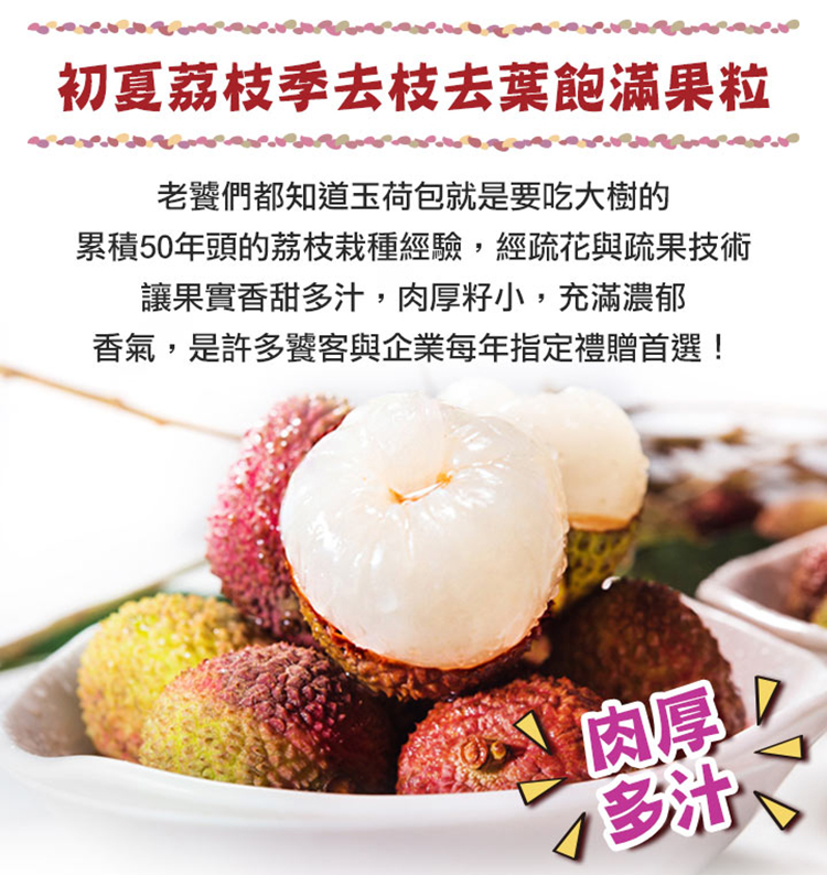 頂級特選玉荷包,人工精選的高品質,果實皮薄果肉豐厚,肉質白嫩Q彈果核小 ,輸日質量果粒、品質等級均居臺灣現有荔枝品種之冠!