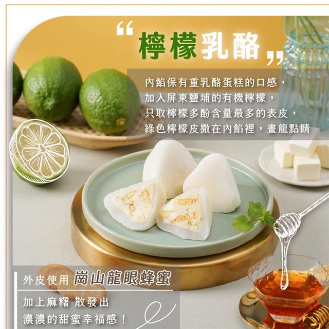 外皮使用崗山龍眼蜂蜜加上麻糬,散發出濃濃的甜蜜幸福感!內餡不止保有重乳酪蛋糕的口感,更加入屏東鹽埔的有機檸檬,只取檸檬多酚含量最多的表皮,畫龍點睛的綠色檸檬皮撒在內餡裡。