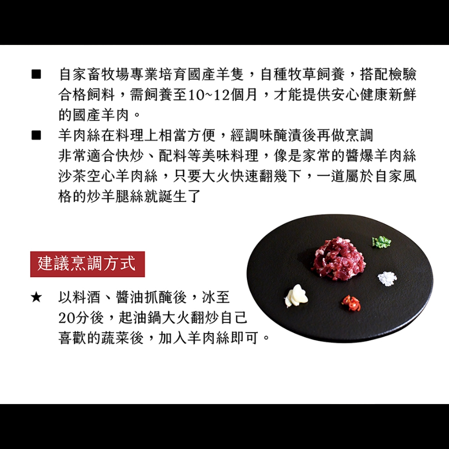 羊肉絲在料理上較為便利,經調味醃製抓調後再做烹調,口感極佳。非常適合快炒配料等美味料理,像是家常的醬爆羊肉絲、沙茶空心羊肉,只要大火快速翻炒幾下,一道屬於自家風味的炒羊肉料理就誕生啦。