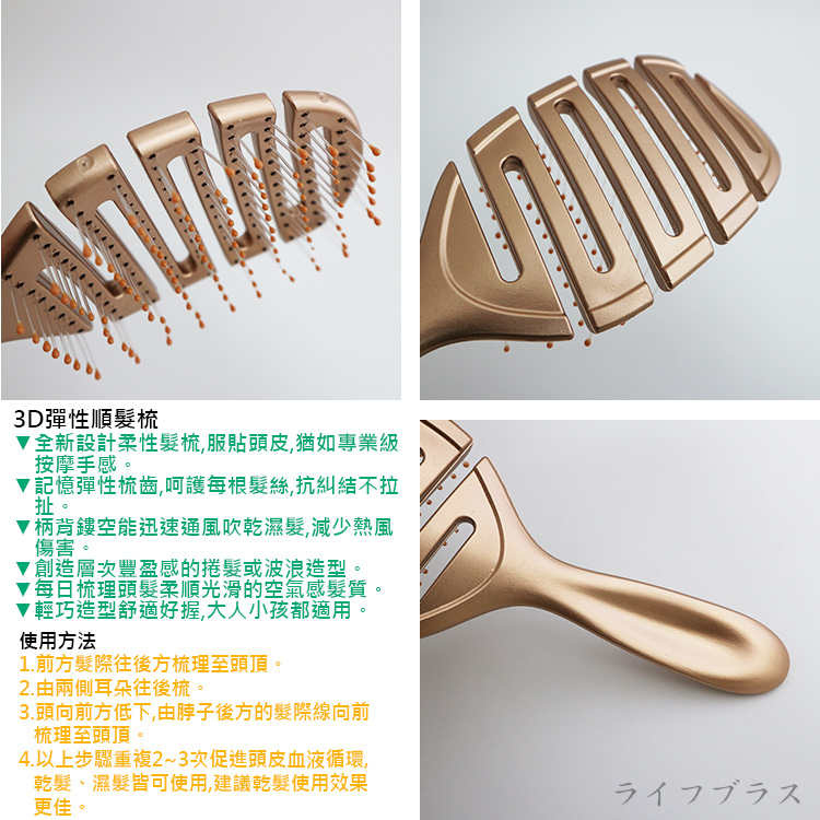 全新設計柔性髮梳,梳理時輕鬆按摩,猶如專業級按摩手感,記憶彈性梳齒,呵護每根髮絲,抗糾結不拉扯,柄背鏤空能迅速通風吹乾濕髮,減少熱風傷害,創造層次豐盈感的捲髮或波浪造型,每日梳理頭髮柔順光滑的空氣感髮質,輕巧造型舒適好握,大人小孩都適用。