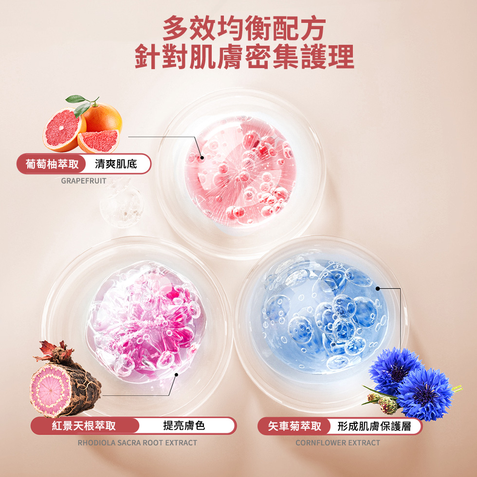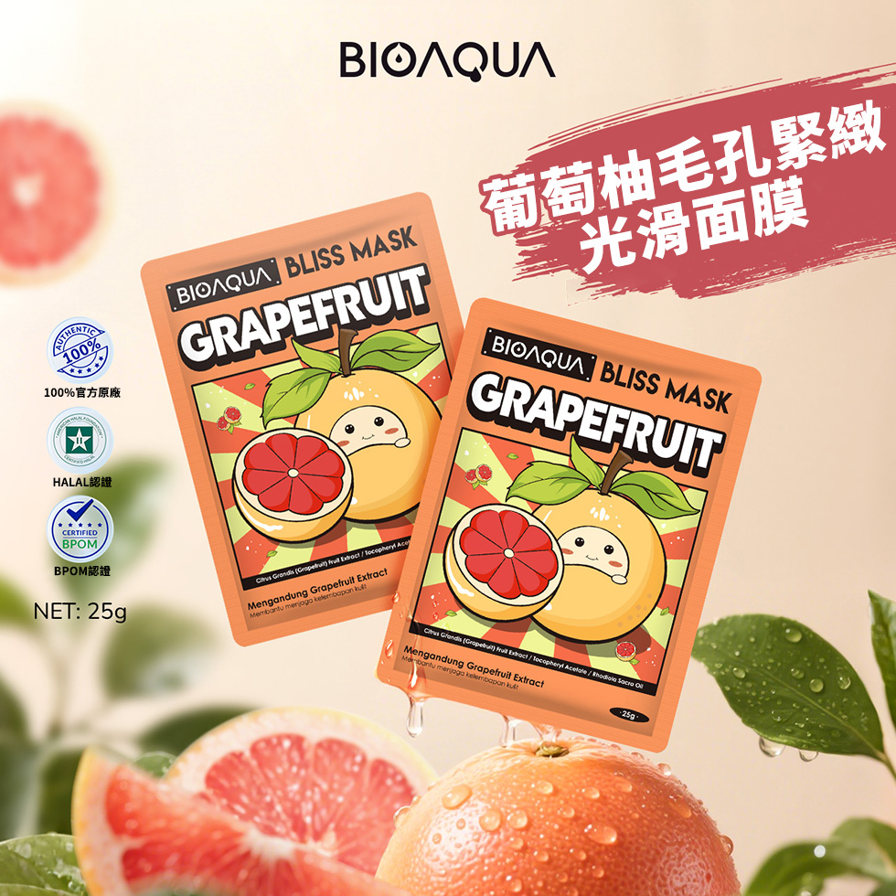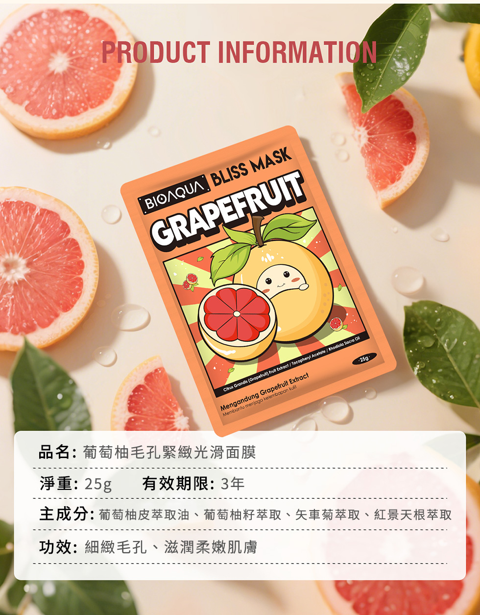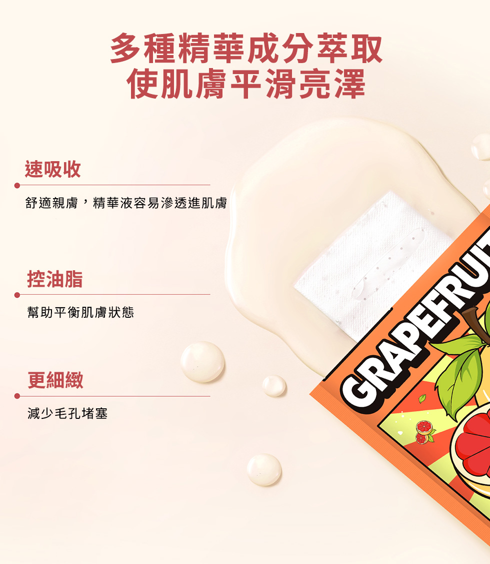 含葡萄柚萃取、矢車菊萃取,可提亮肌膚、減少毛孔堵塞,使肌膚光滑亮澤,適合混合油性肌膚。親膚透氣面膜布,360°貼合臉部肌膚,幫助精華滲透肌底。