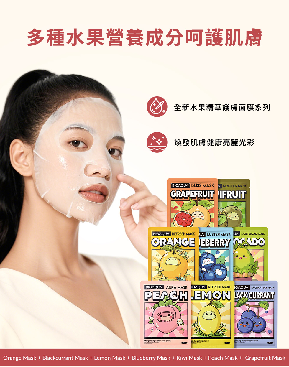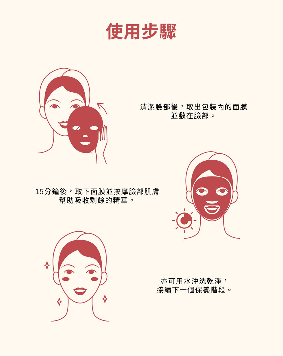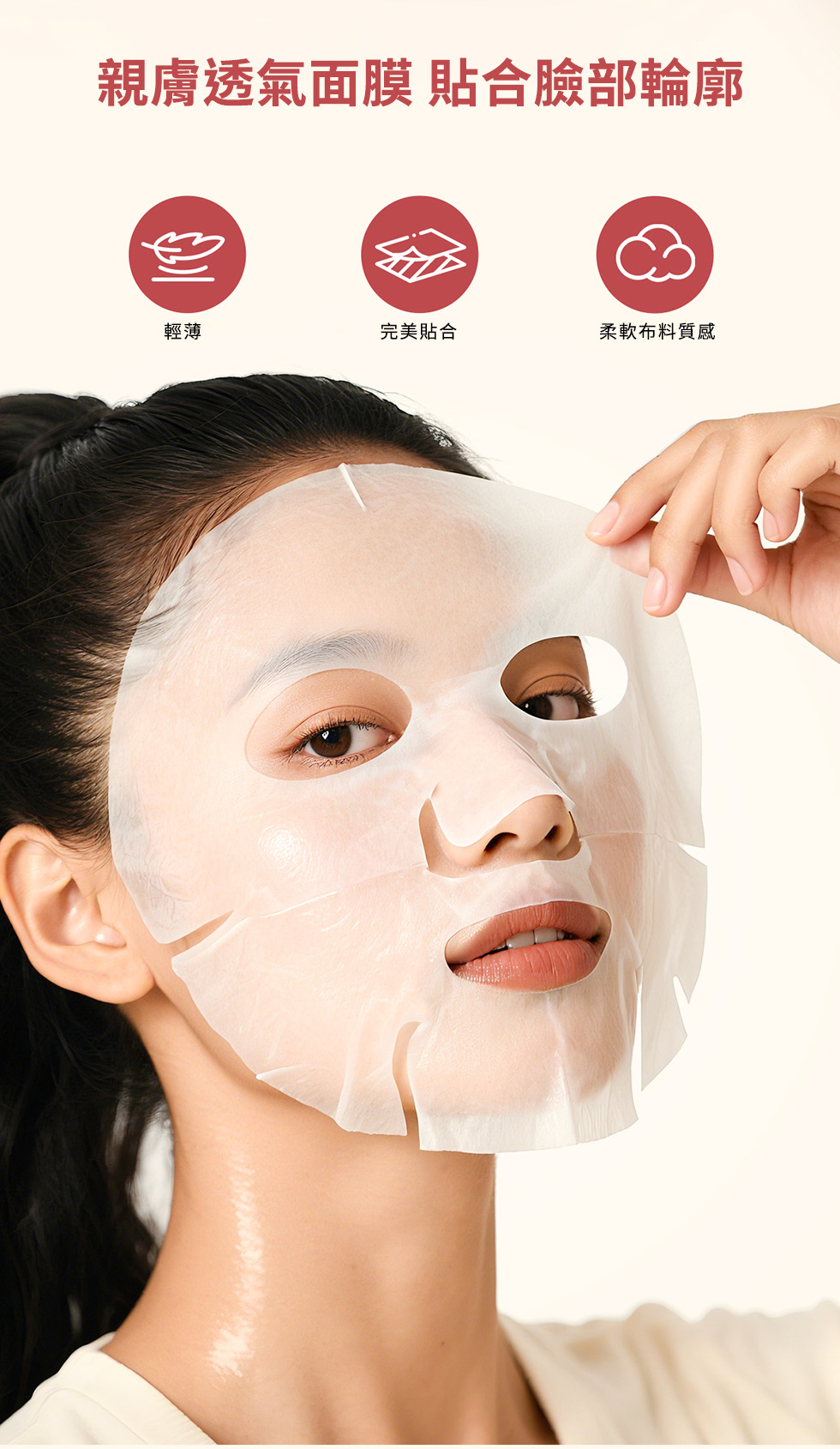 含葡萄柚萃取、矢車菊萃取,可提亮肌膚、減少毛孔堵塞,使肌膚光滑亮澤,適合混合油性肌膚。親膚透氣面膜布,360°貼合臉部肌膚,幫助精華滲透肌底。