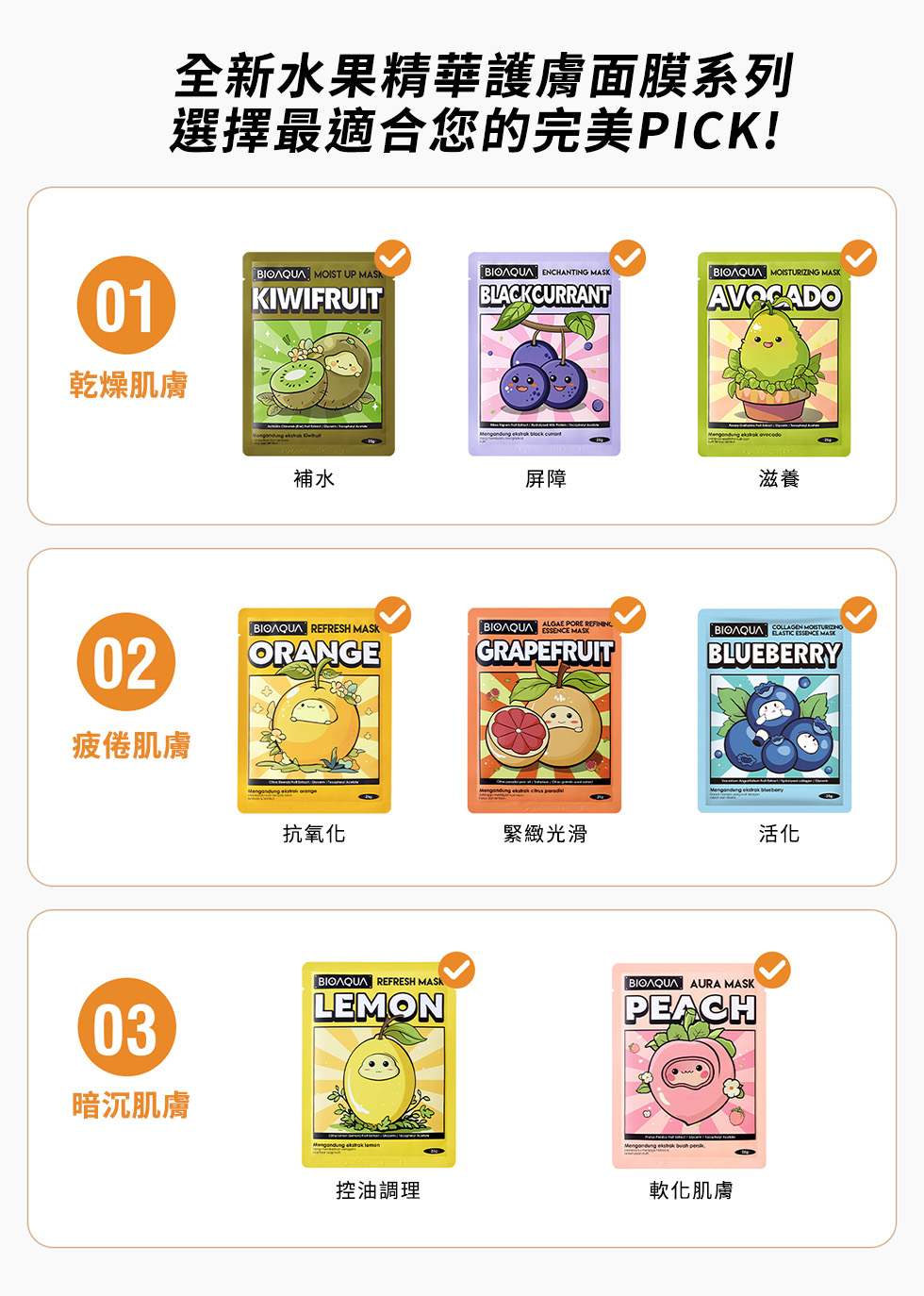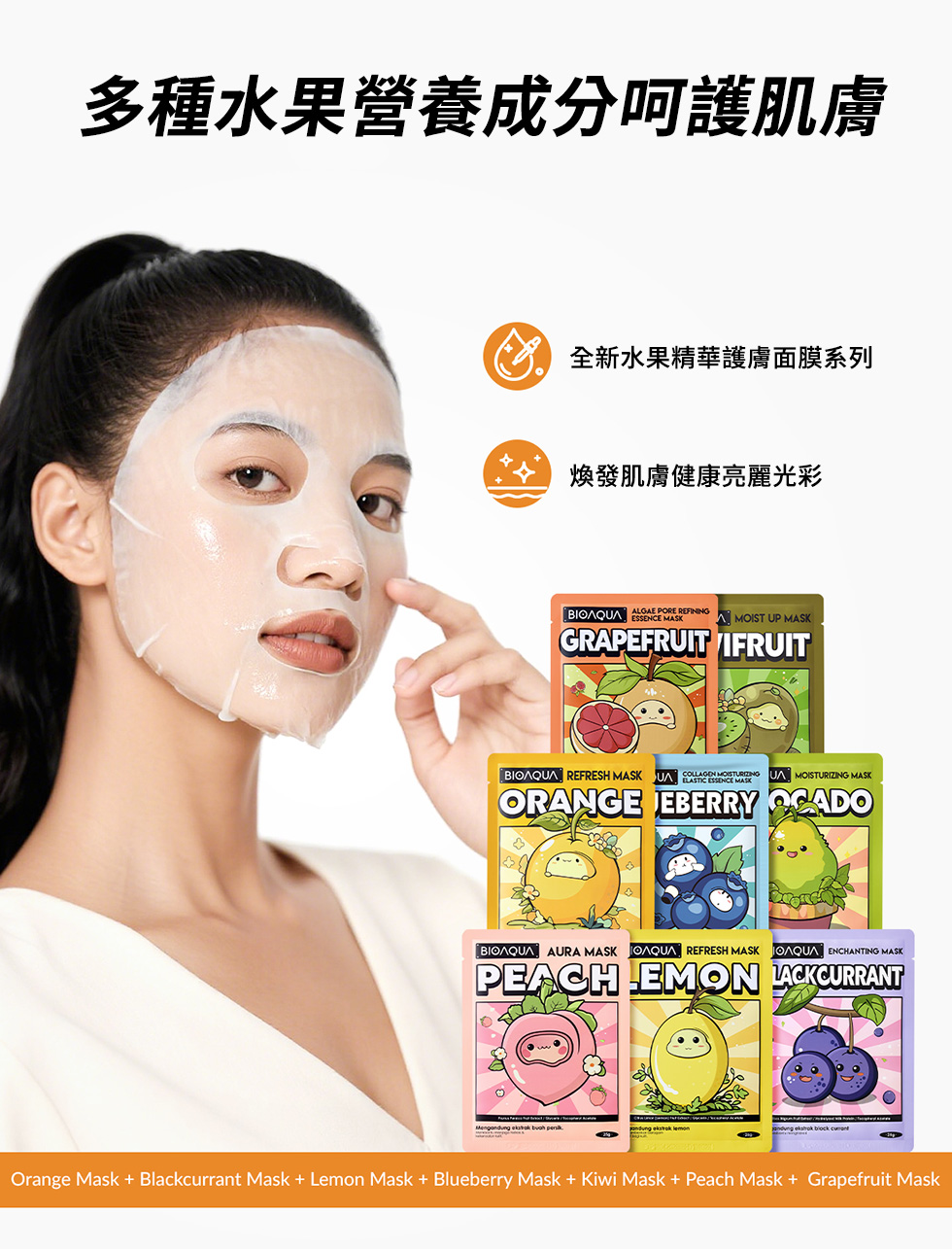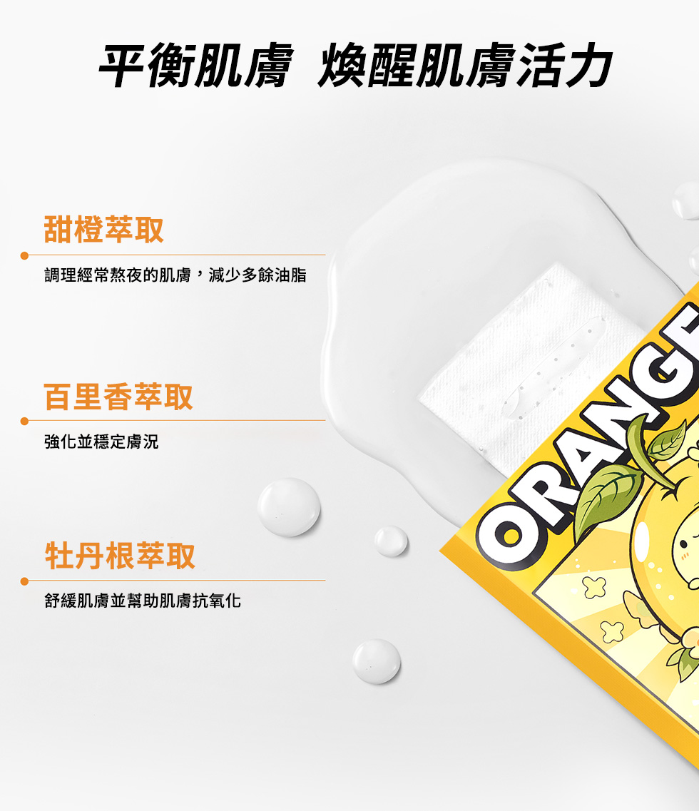 含甜橙、牡丹根、百里香萃取,幫助肌膚調理油水平衡,強化並穩定膚況,適合疲倦肌膚。親膚透氣面膜布,360°貼合臉部肌膚,幫助精華滲透肌底。