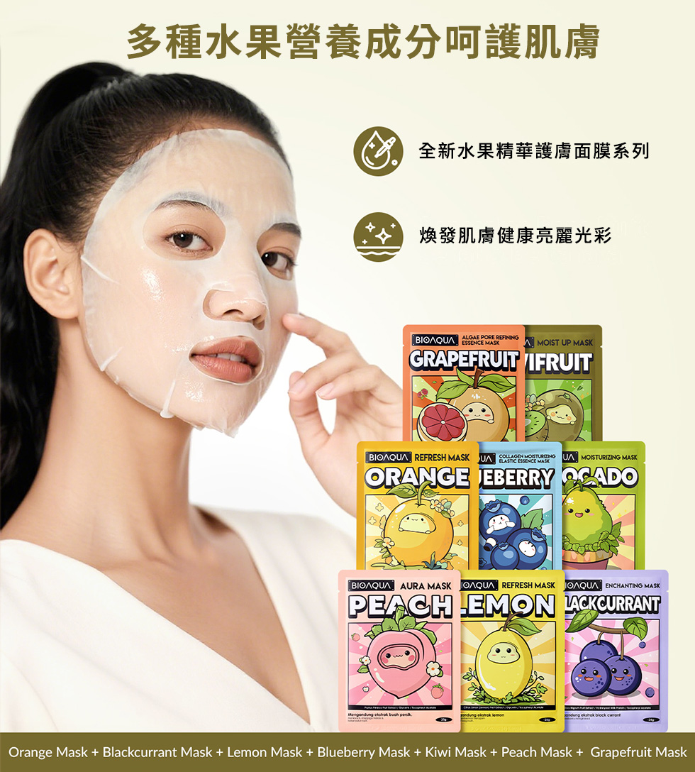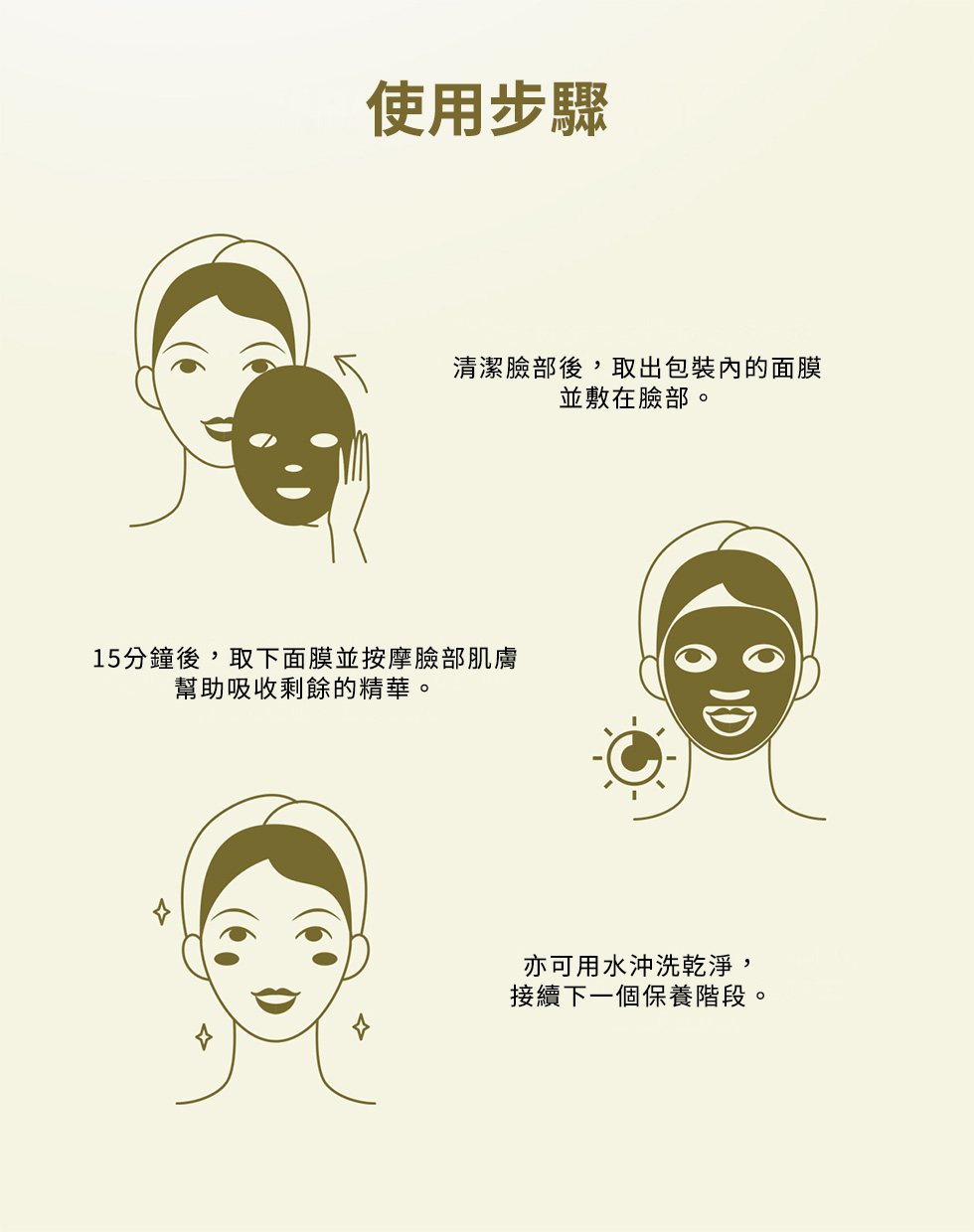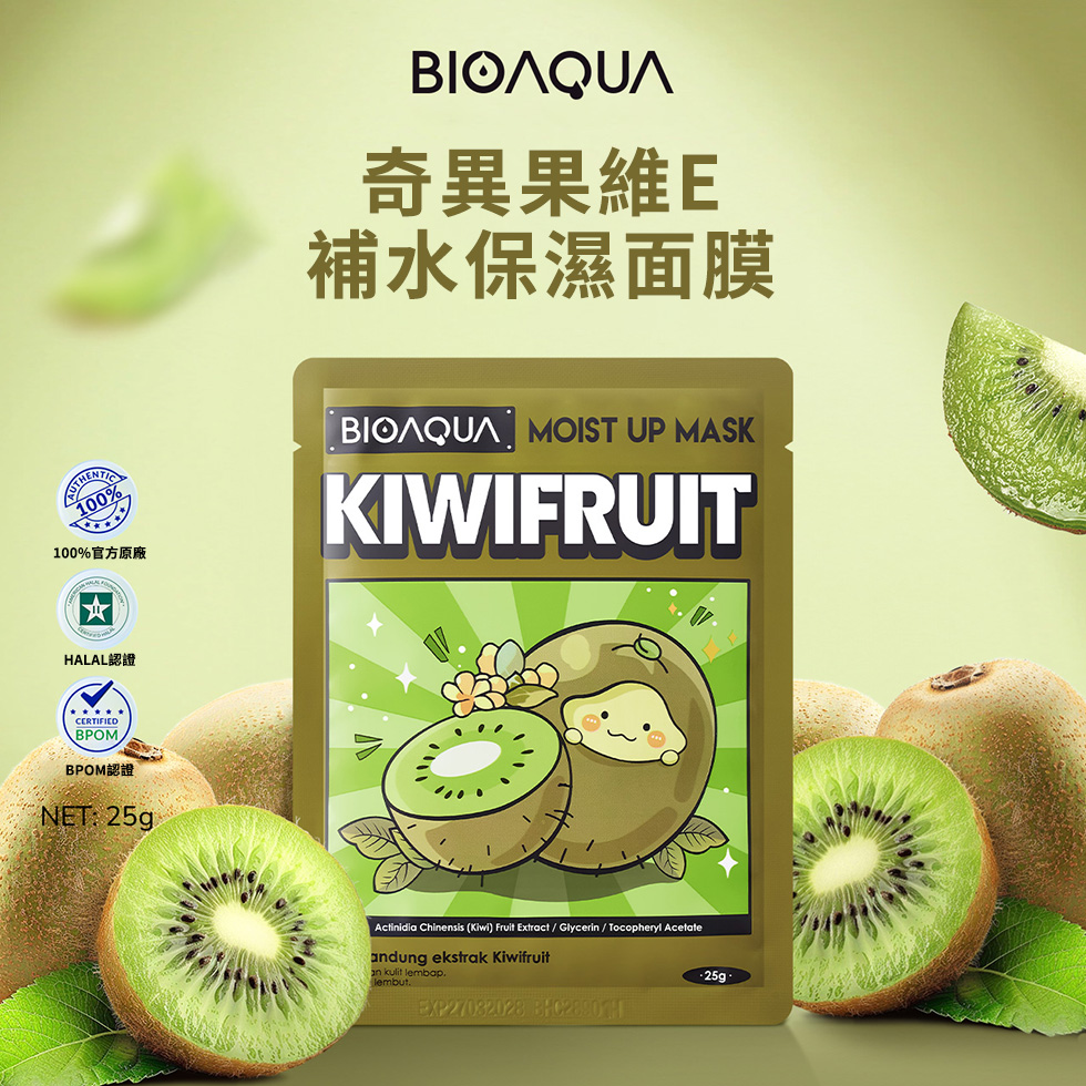 含奇異果萃取、維他命E、生物素,潤澤肌膚同時鎖住水分,讓肌膚光滑、柔軟,適合乾燥肌膚。親膚透氣面膜布,360°貼合臉部肌膚,幫助精華滲透肌底。