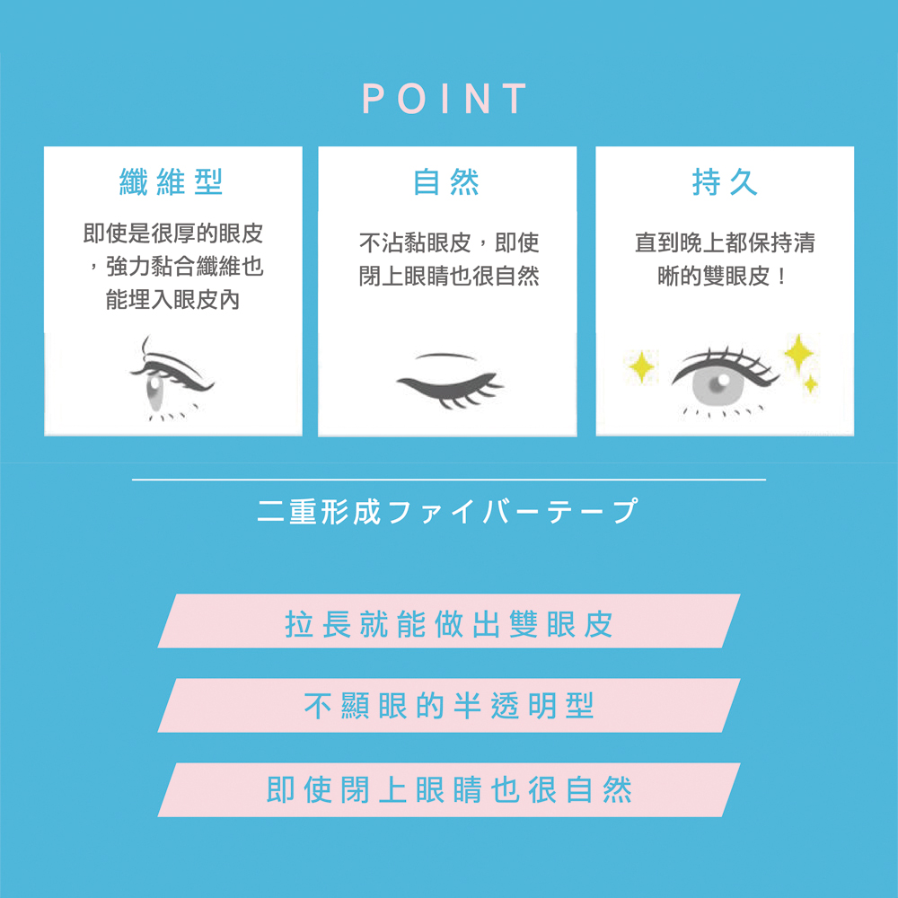 纖維型雙眼皮設計,線條細緻自然,貼合眼皮不厚重,日本原進口品質穩定