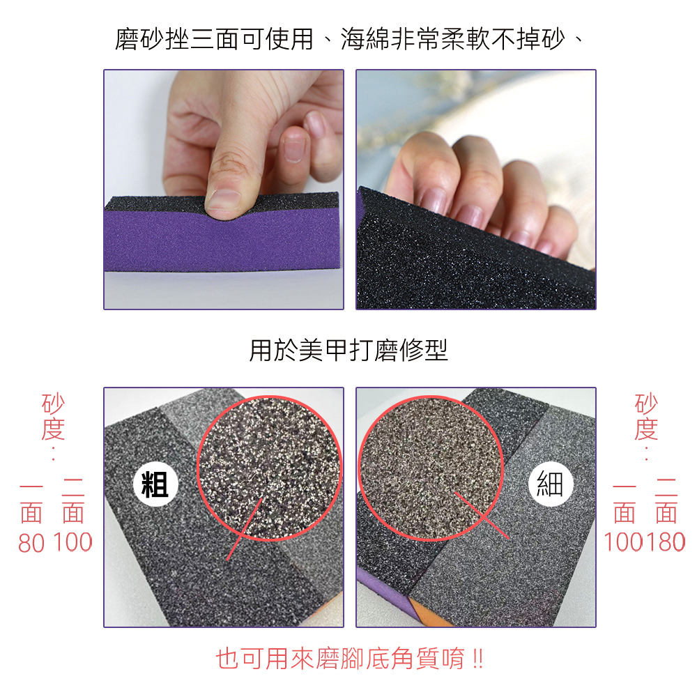 • 水砂兩用設計| 乾磨或濕磨皆可使用• 細緻磨砂面| 修整指甲邊緣更平滑• 輕鬆修型| 調整指甲長度與形狀• 實用2入組| 居家與外出備用都方便• 日常美甲工具| 修甲保養輕鬆完成