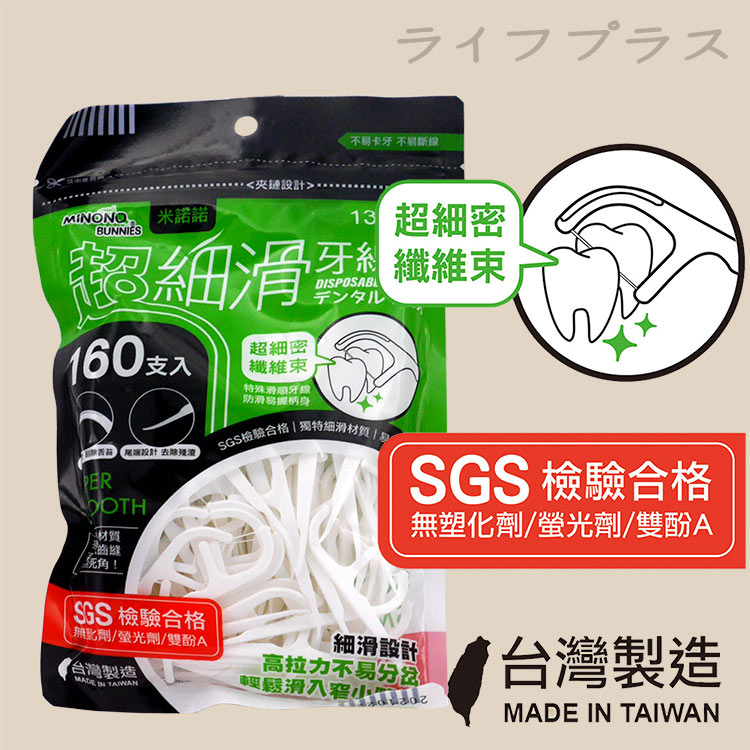 臺灣製造品質安心,SGS檢驗合格使用安心,超細密纖維束好用不易斷裂,超細滑輕易滑入齒縫,握柄止滑扁面設計,好握好用,尾端設計,剔除異物更容易,清潔牙縫。