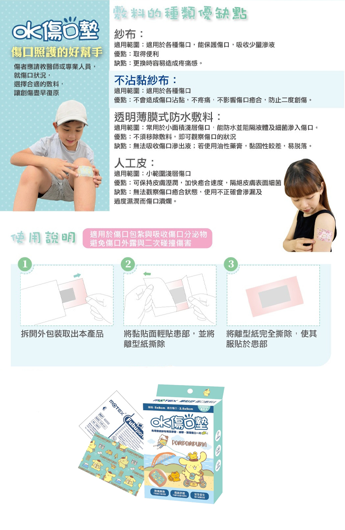 ◆免用傳統紗布塊及膠帶、繃帶,護理傷口一片OK!◆透氣舒適、延展性佳,採用醫療級低過敏膠種◆無痛撕換的不黏性傷口吸收墊,不易造成二次傷害◆安全衛生,單片GAMMA滅菌包裝入數:8片/盒尺寸:約5cm*8cm適合傷口:2.5cm*5cm材質:舒柔、針紮棉、不黏傷口薄膜產地:台灣產品資訊品名:摩貼舒 傷口敷料(滅菌)製造日期/批號:請詳見包裝標示有效期間:五年生產/製造商/委製商:華新橡膠工業股份有限公司田中廠電話:04-8752116地址:彰化縣田中鎮沙崙里中州路二段751號醫療器材許可證字號:衛署醫器製壹字第004922號-販售業者永豐耀有限公司台北市信義區松德路65號11樓之1電話:02-8791-2338統一編號:54648130消費者服務電話:02-8791-2337販賣業藥商許可執照:北市衛藥販(信)字第620117S356 號「消費者使用前應詳閱產品說明」西藥、醫療器材、含藥化粧品許可證查詢:衛生福利部食品藥物管理署(www.fda.gov.tw)\業務專區\藥品\資訊查詢\藥物許可證暨相關資料查詢作業\西藥、醫療器材、含藥化粧品許可證1、單片包裝若於開封前已破損,滅菌狀態即消失,請勿使用。2、禁止二次使用,請儲存於陰涼乾燥處,避免本產品變質。3、若出現紅腫、發癢等狀況,請立即停止使用。4、使用GAMMA照射滅菌,產品泛黃屬正常現象。5、產品示意圖之包裝插圖與實際產品略有差異,請依實際商品顏色為準。保存期限:依包裝所示製造日期:依包裝所示產品使用前說明「消費者使用前應詳閱產品說明書」販售業者名稱:合躍生活廣場事業股份有限公司業者地址:彰化市中正路一段253號2樓業者諮詢電話:04-7636339業者服務時間:周一至周五08:30〜17:00(國定例假日休)業者許可證明或登記證明:彰縣縣藥販字第6237017431號西藥、醫療器材、含藥化粧品許可證查詢:衛生福利部食品藥物管理署(www.fda.gov.tw)》業務專區(藥品\資訊查詢\藥物許可證曁相關資料查詢作業\西藥、醫療器材、含藥化粧品許可證中藥許可證查詢:衛生福利部中醫藥司(www.mohw.gov.tw/CHT/DOCMAP)\中藥藥品許可證查詢
