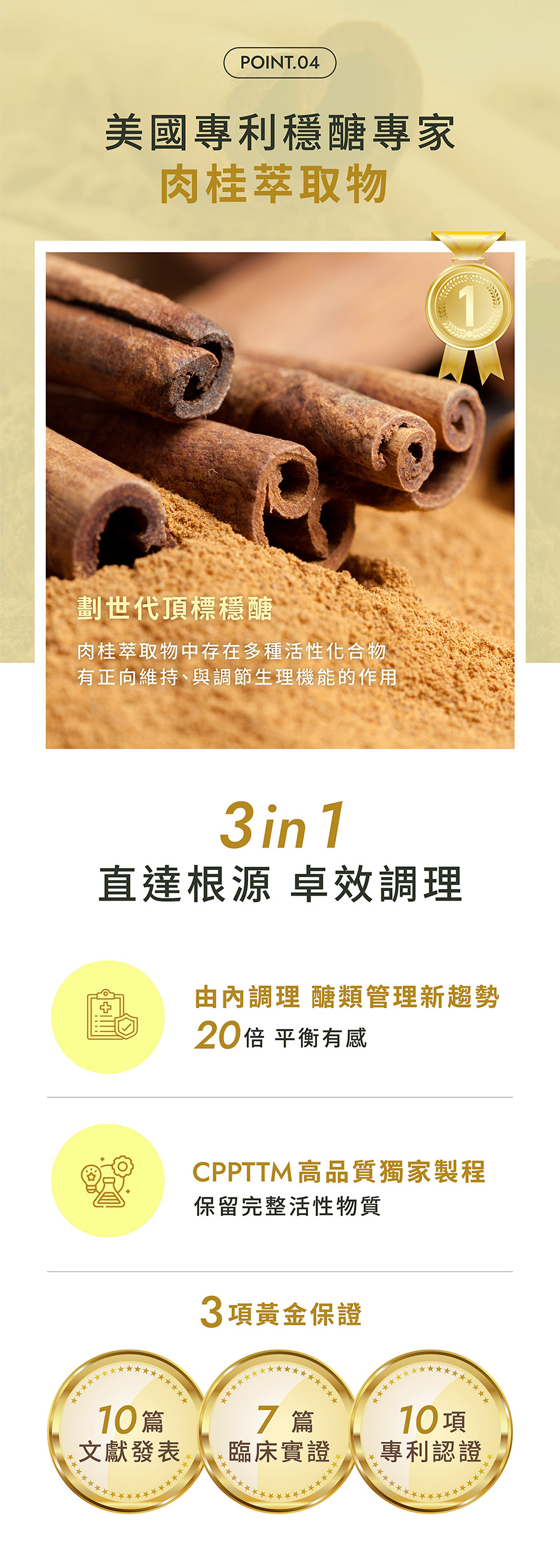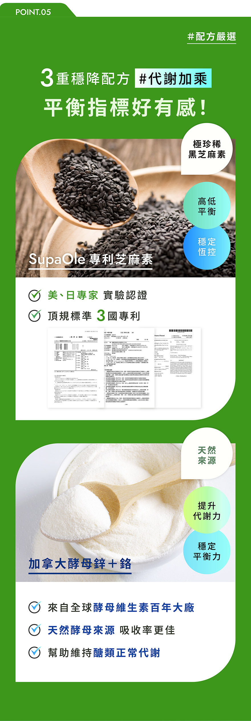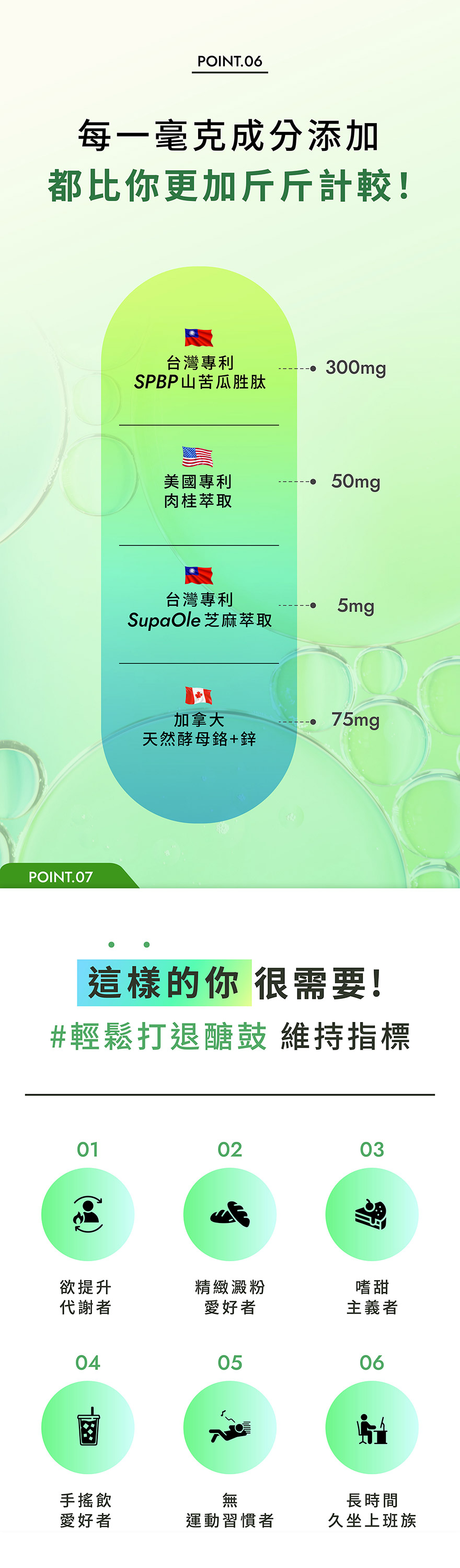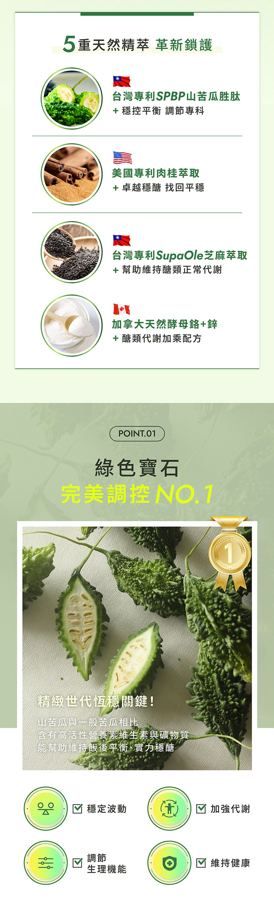 專利調節配方,維持平衡好穩定!SPBP專利山苦瓜全方面穩定,肉桂萃取+專利芝麻素+酵母鉻+酵母鋅助醣類正常代謝、調節生理機能。