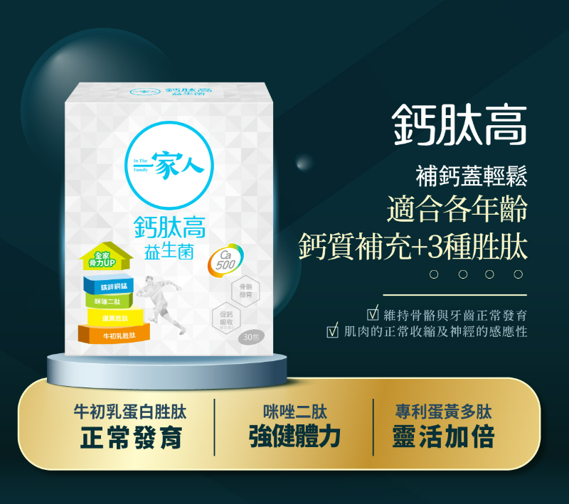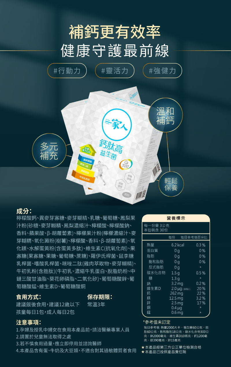 檸檬酸鈣,含500毫克滿足9成台灣人缺改狀況;維生素D,增進體內鈣吸收,維持神經肌肉正常生理;3種乳酸菌,幫助調節生理機能;3種胜肽,補鈣加肽,鎖住鈣不流失