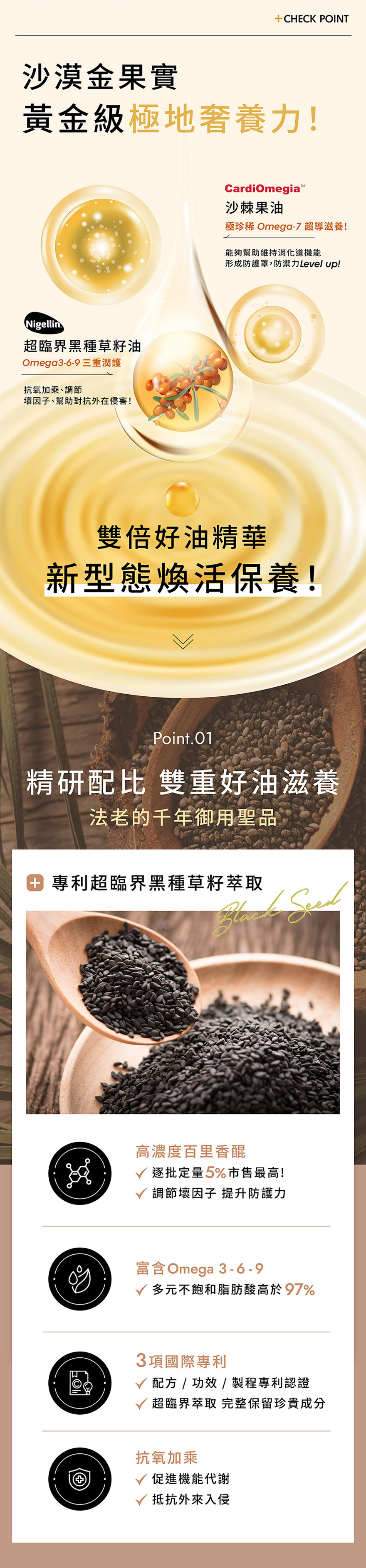 青藏高原有機沙棘純果+黑種草籽萃取,補充Omega 3-6-7-9、定量百里香醌全面守護,全素可食。