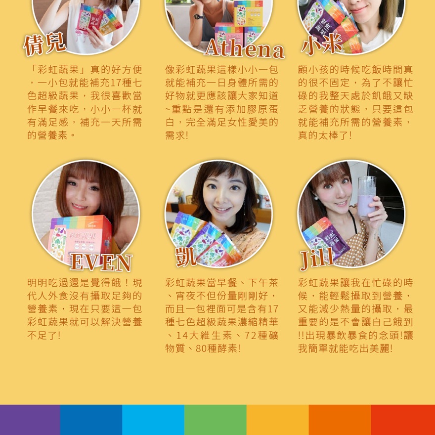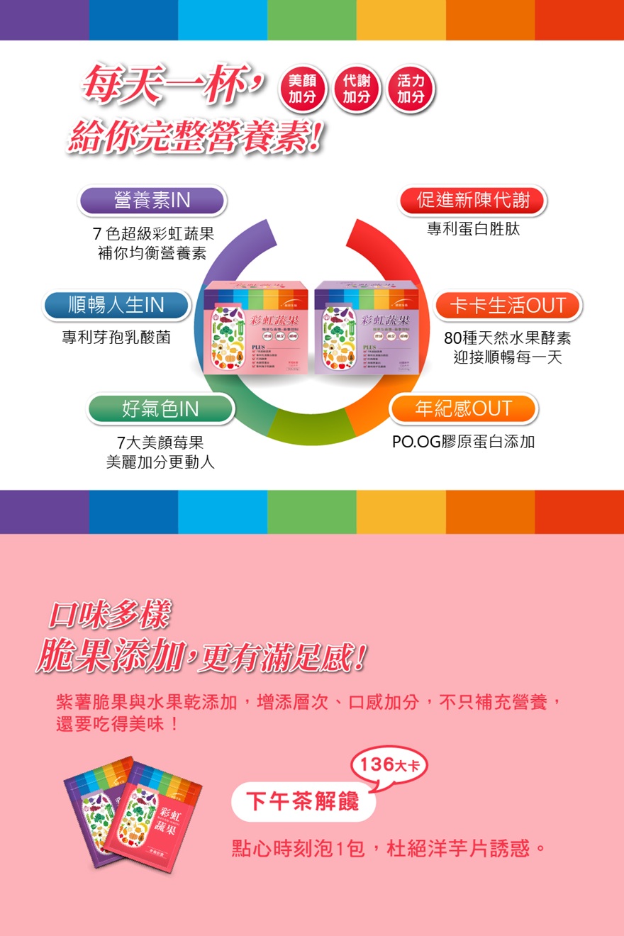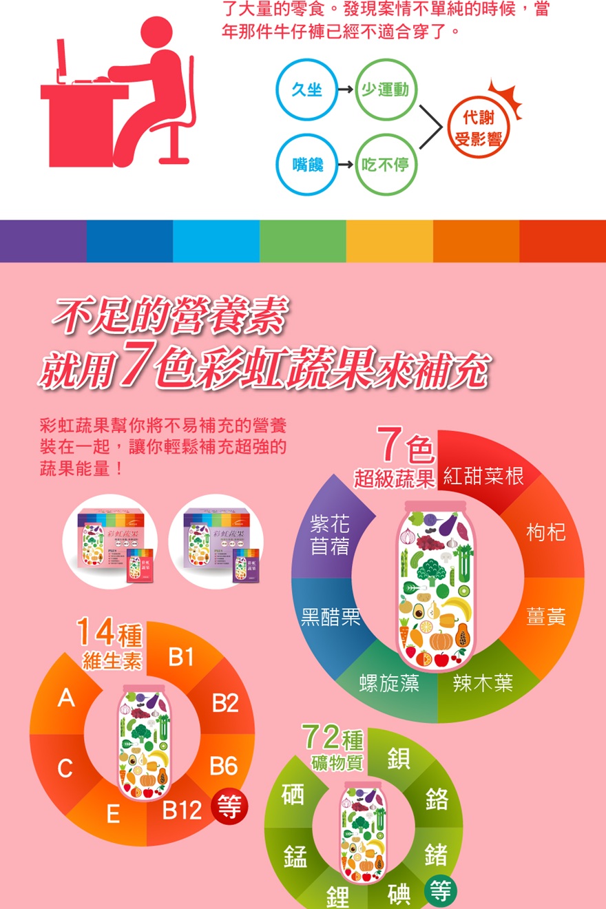 ●7色彩虹超級蔬果、14種維生素、72種礦物質,含有最均衡的營養素,吃出美力與食力!