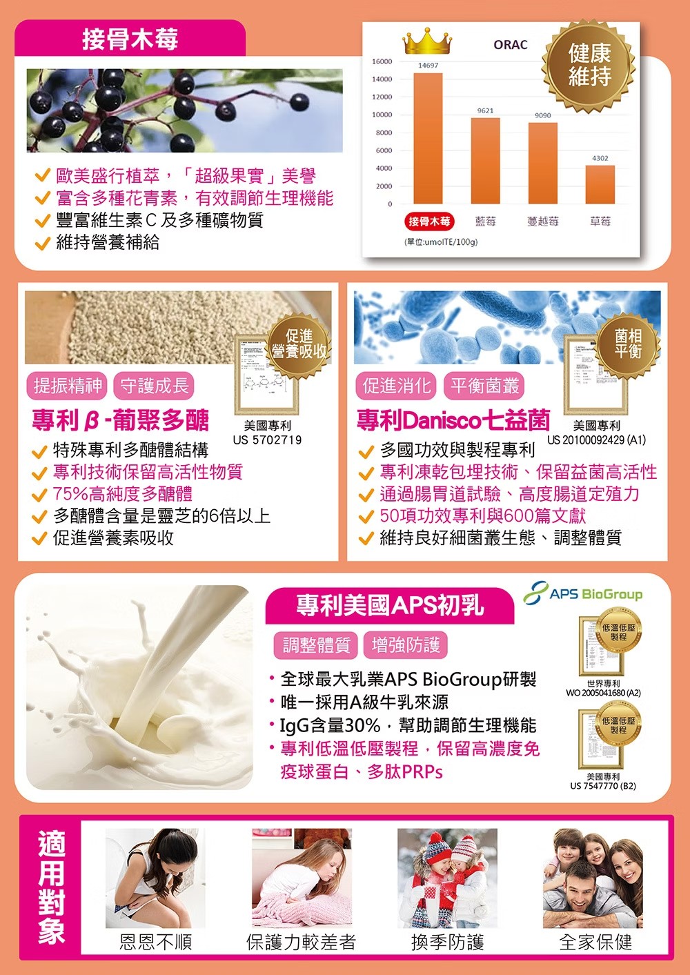 【商品特色】.日本森永乳鐵蛋白,調整嬰幼兒體質。.接骨木莓,富含多種花青素調節生理機能。.β-葡聚多醣,75%高純度多醣體。.七益菌專利凍乾包埋技術、保留