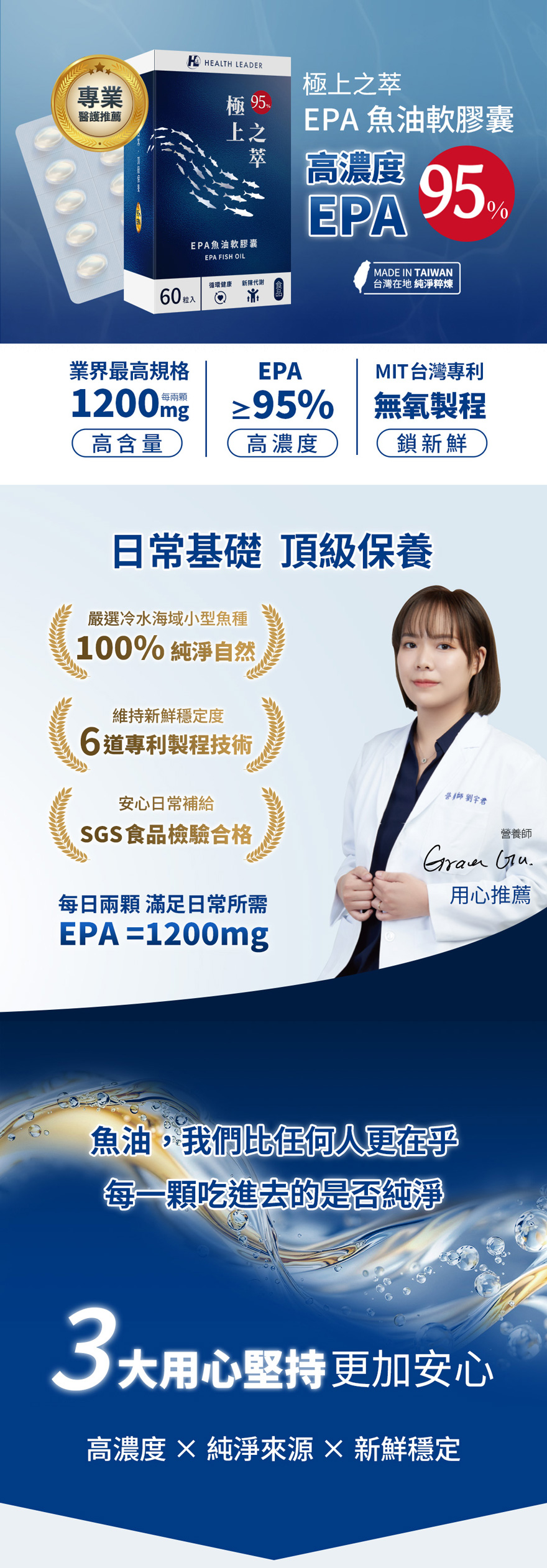 高濃度 95% EPA 每日兩顆EPA=1200mg新鮮穩定|無氧製程,減少氧化保持新鮮無重金屬|源自冷水海域小型鯷魚,純淨安心專利萃取|精準保留 Omega-3、EPA,減少雜質殘留國際認證|原料通過 IFOS、GOED 認證規格容量:一盒60顆軟膠囊食用方法:每天2顆,加強每天3顆,餐後食用