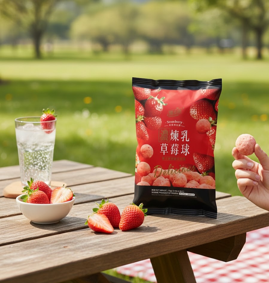 玉米粉、棕櫚油、砂糖、水、全脂奶粉、草莓果汁粉(草莓濃縮汁、麥芽糊精、氧化澱粉、紅甜菜汁、檸檬酸、香料)、加糖全脂煉乳、香料、食用紅色四十號