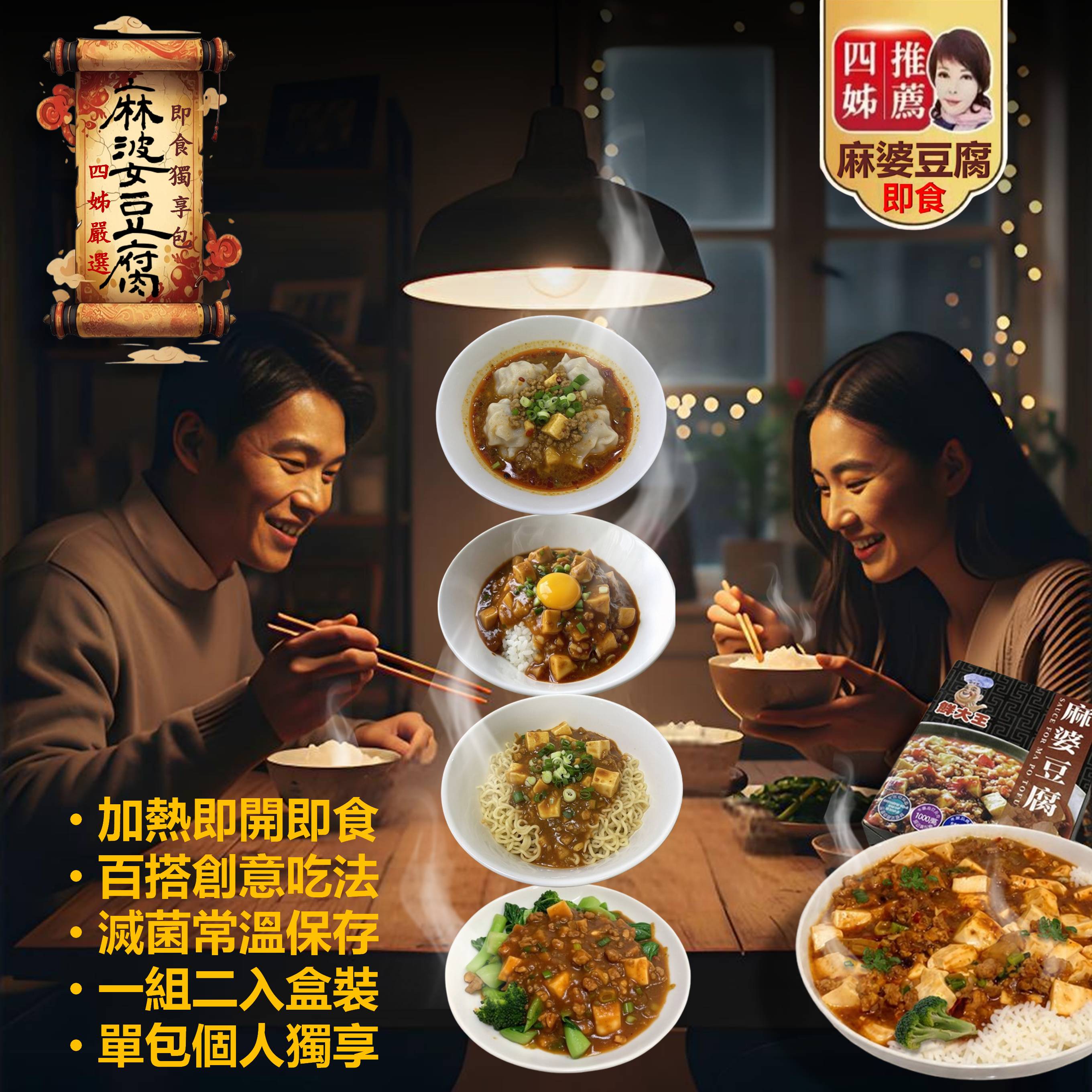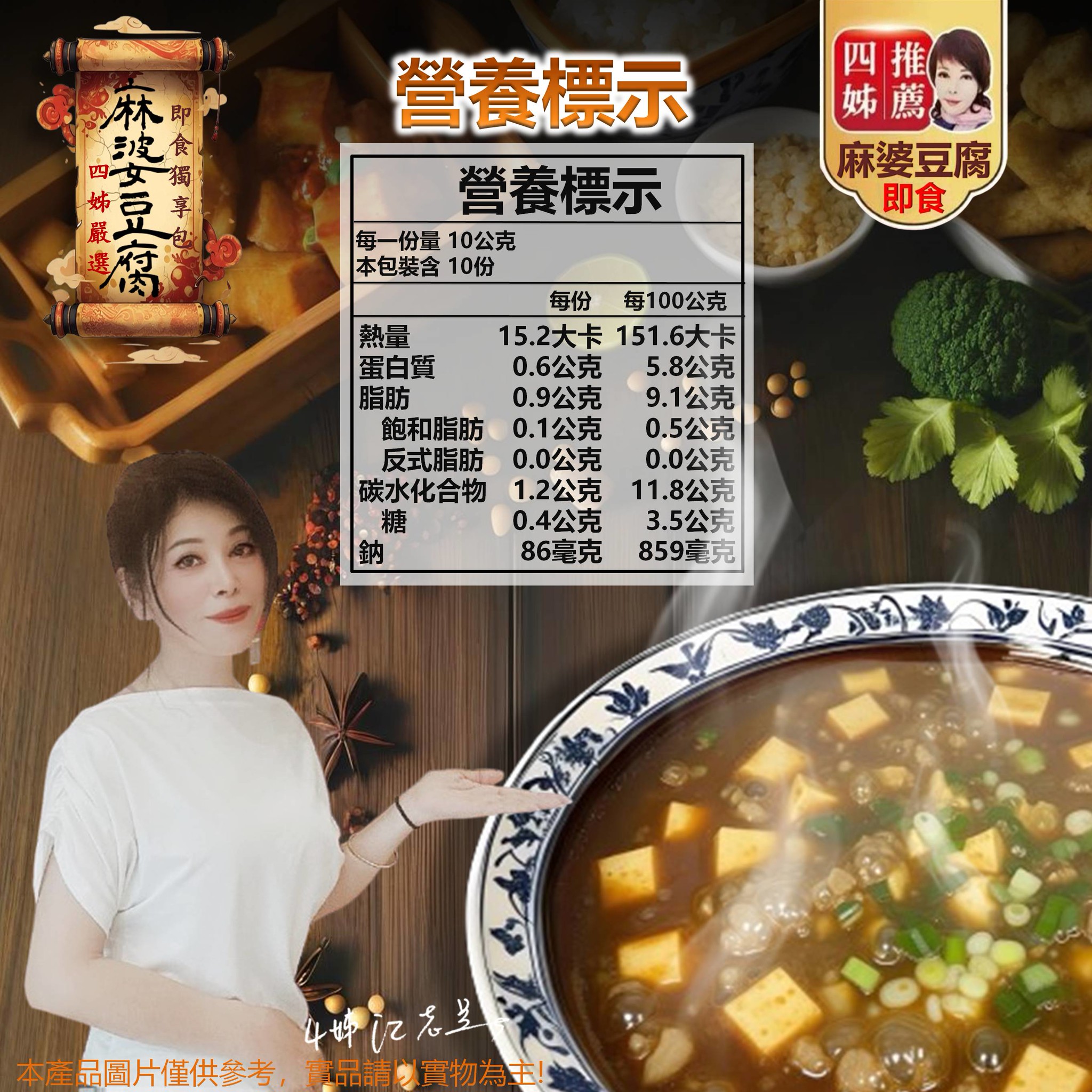 豆腐、水、豬肉、味噌(黃豆、米、鹽)、沙拉油(大豆)、辣椒醬(辣椒、鹽)、豆醬(黄豆、水、米、鹽)、糖、醬汁(水、黄豆、小麥)、麥芽糊精、蕃茄糊、鹽、花椒油(花椒、大豆油)、香油(芝麻、大豆油)、乙醯化己二酸二澱粉、花椒粉、乾木耳絲、檸檬酸鈉(調味劑)、異抗壞血酸訥(抗氧化劑)、蒜粉、胺基乙酸、DL-胺基丙酸、5+核糖核苷酸二鈉(5-次黃嘌呤核核嵌酸二鈉、5”-鳥嘌吟核苷磷酸二鈉)、甜味劑(甘草酸鈉)。