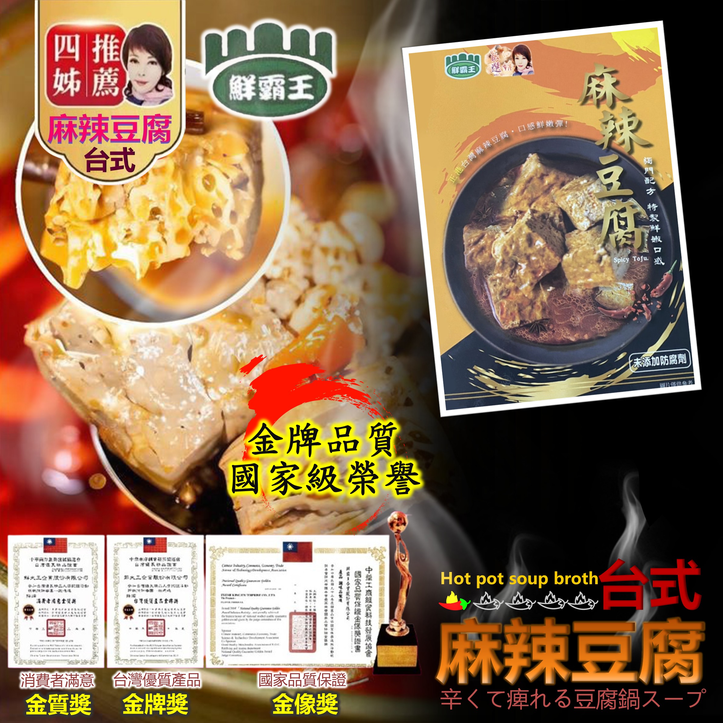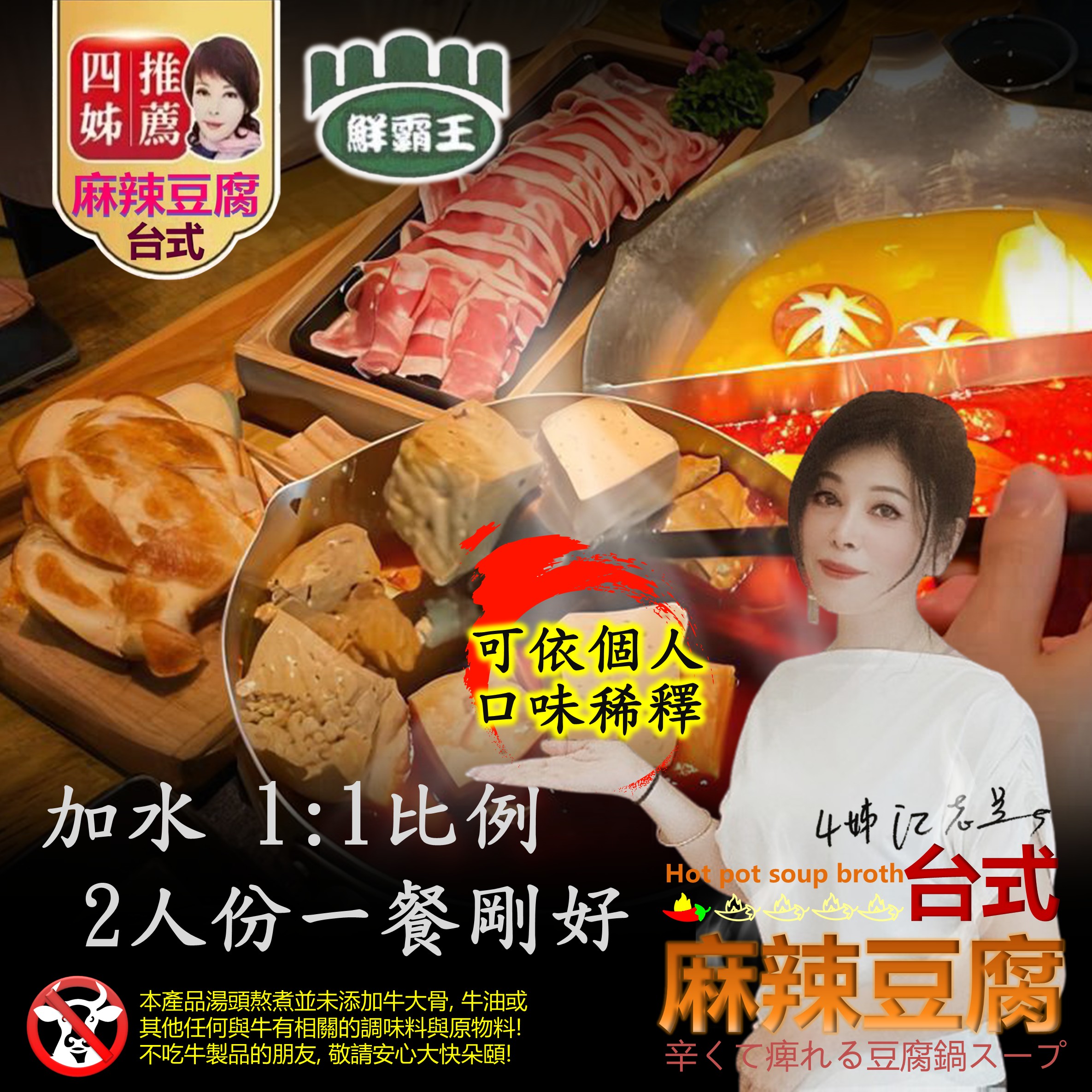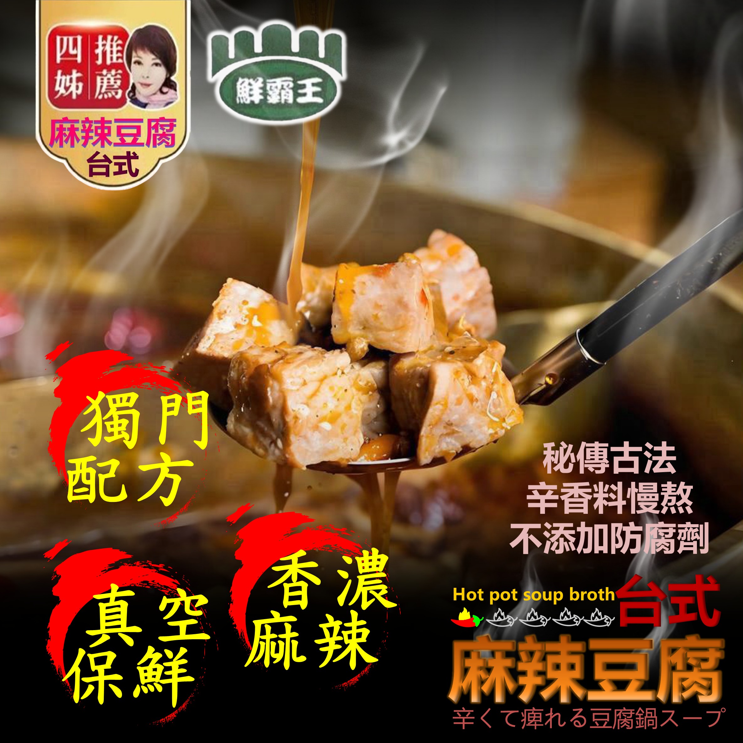 水、豆腐、酸菜、辣椒醬(辣椒、鹽)、沙拉油、黄豆醬(黄豆、鹽)、乙醯化己二酸二澱粉(黏稠劑)、花椒、糖、鹽、DL-胺基丙酸、醬汁(水、黄豆、小麥、鹽)、5’-核糖核苷酸二鈉(5’-次黃嘌呤核苷磷酸二钠、5’ -鳥嘌呤核苷磷酸二鈉)、黑胡椒椒粉、油桂粉、香蒜粉、香油(芝麻、沙拉油)、油性辣椒紅、甘草酸的、氨基乙酸(調味劑)、酵母抽出物、白胡椒粉、八角粉、L-麩酸鈉、(調味劑)、琥珀酸二鈉、檸檬酸鈉(調味劑)。