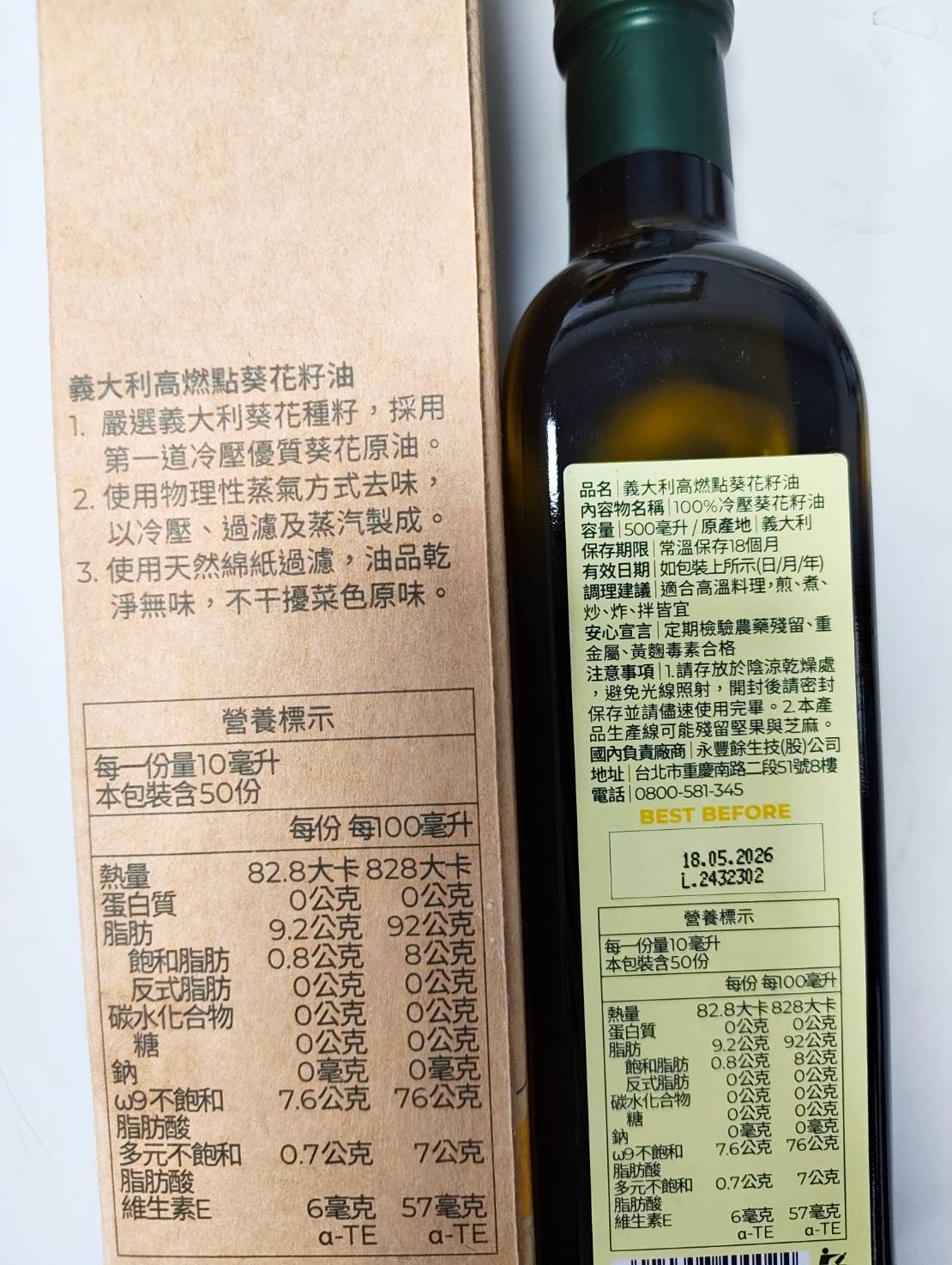 1. 嚴選義大利葵花種籽,採用第一道冷壓優質葵花原油。