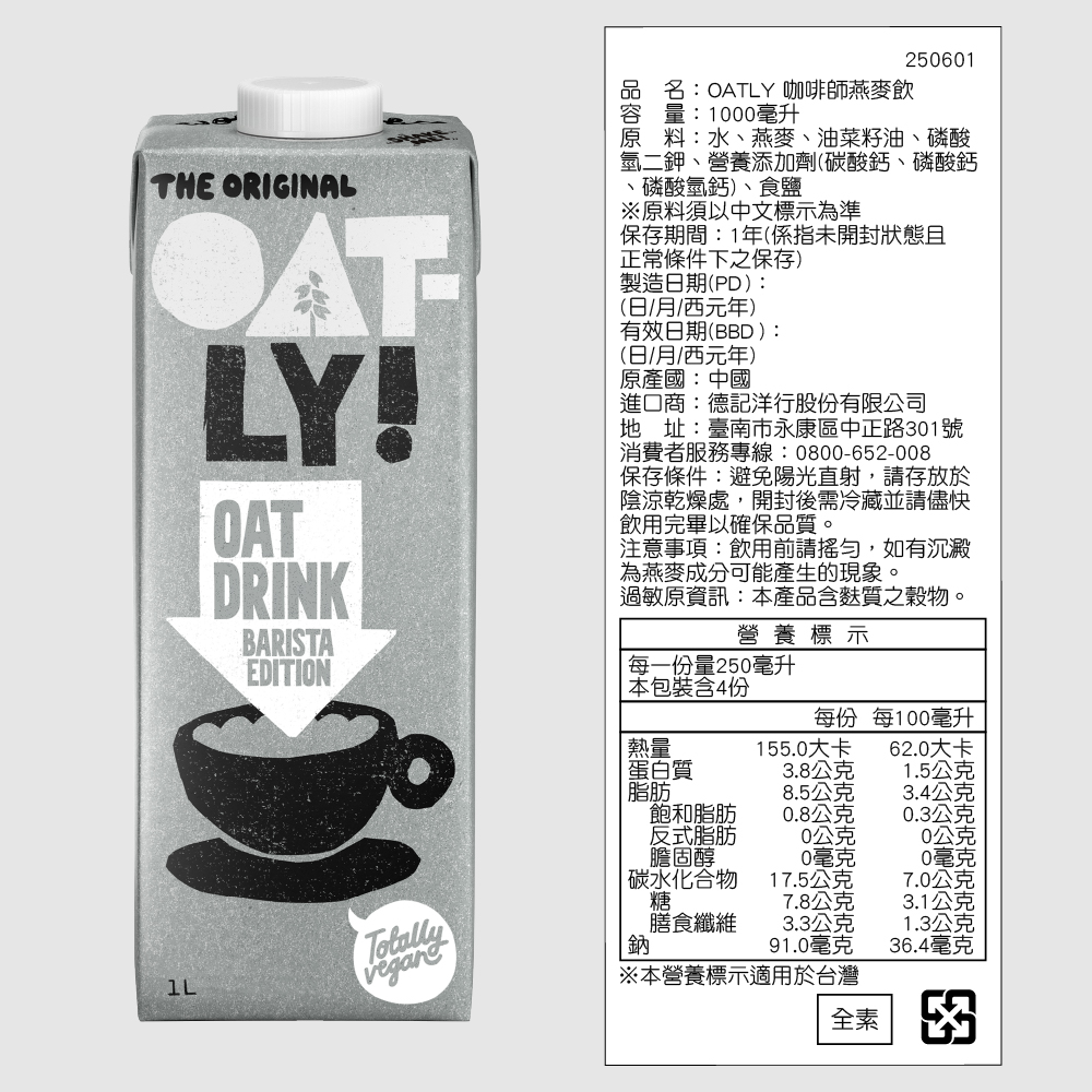 原料:水、燕麥、油菜籽油、磷酸氫二鉀、營養添加劑(碳酸鈣、磷酸鈣、磷酸氫鈣)、食鹽