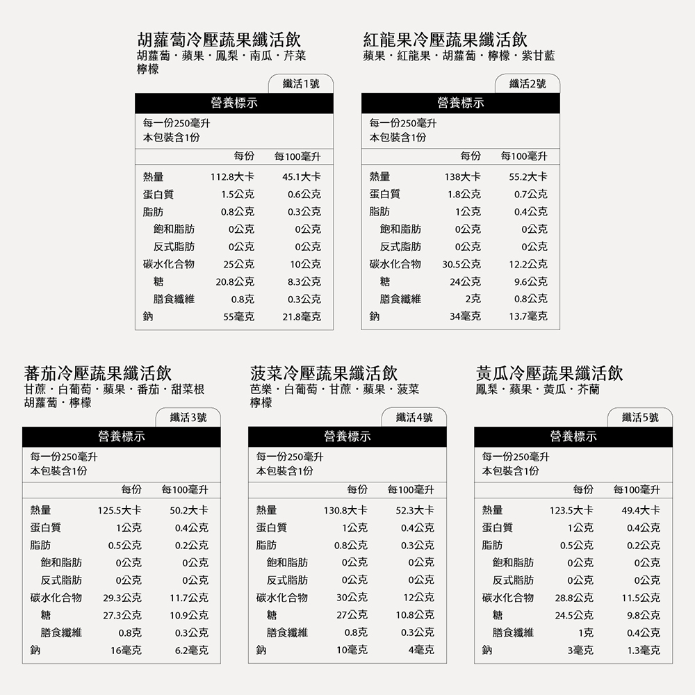 ▪︎ 纖活7號-黃金奇異果冷壓蔬果纖活飲:蘋果、葡萄、黃金奇異果、黃瓜、鳳梨、南瓜 ▪︎ 纖活8號-甜菜根冷壓蔬果纖活飲:鳳梨、甘蔗、石榴、蘋果、芹菜、甜菜根、檸檬 ▪︎ 纖活9號-甜椒冷壓蔬果纖活飲:西瓜、蘋果、黃瓜、檸檬、甜椒 ▪︎ 纖活10號-羽衣甘藍冷壓蔬果纖活飲:蘋果、奇異果、鳳梨、芭樂、菠菜、甘藍、苦瓜、金橘 ▪︎ 纖活11號-百香果冷壓蔬果纖活飲:西瓜、芭樂、鳳梨、黃金奇異果、百香果、甜椒 ▪︎ 纖活12號-柳橙冷壓蔬果纖活飲:椪柑、柳橙