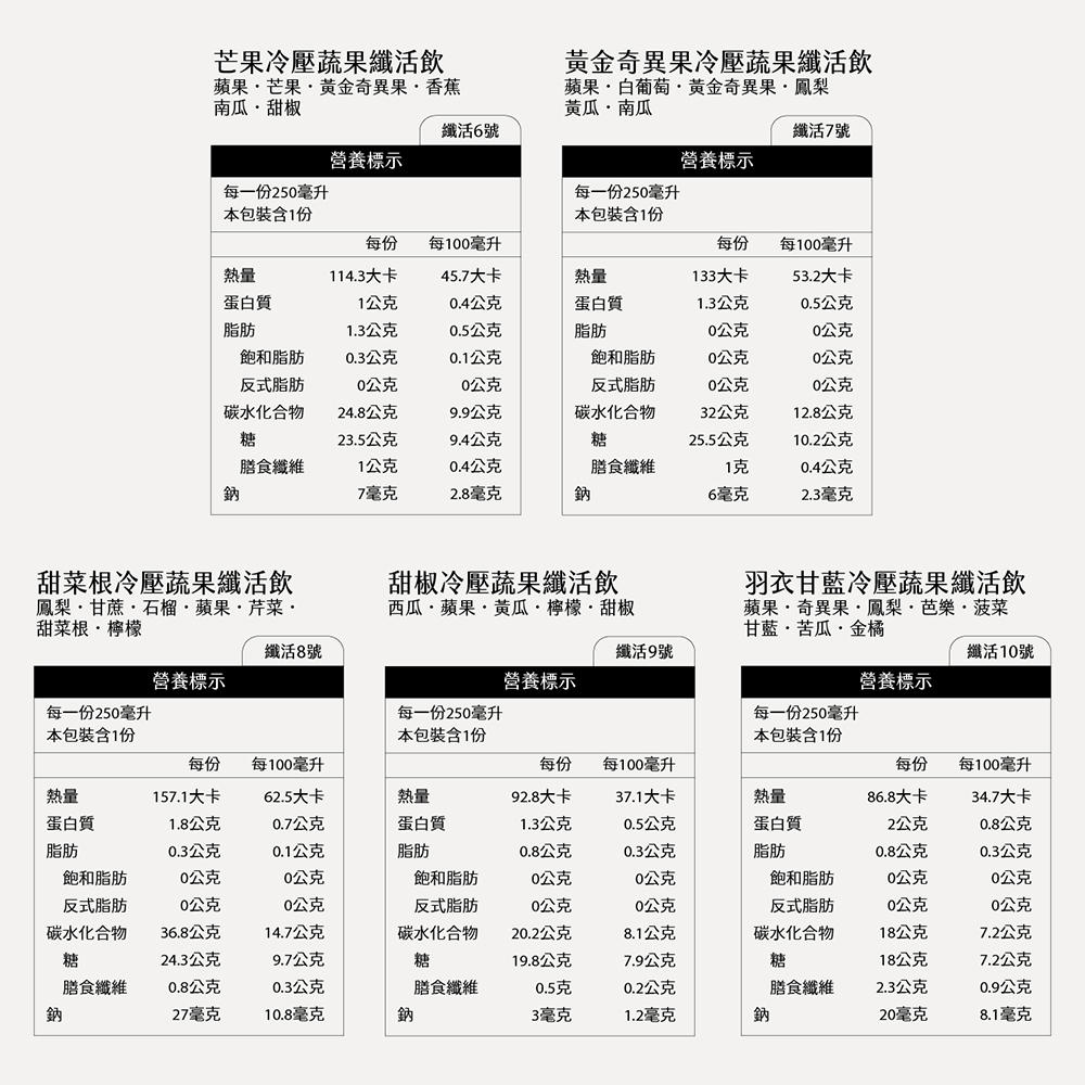 ▪︎ 纖活7號-黃金奇異果冷壓蔬果纖活飲:蘋果、葡萄、黃金奇異果、黃瓜、鳳梨、南瓜 ▪︎ 纖活11號-百香果冷壓蔬果纖活飲:西瓜、芭樂、鳳梨、黃金奇異果、百香果、甜椒 ▪︎ 纖活12號-柳橙冷壓蔬果纖活飲:椪柑、柳橙
