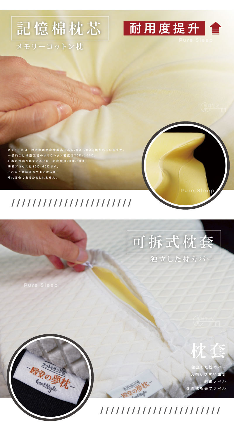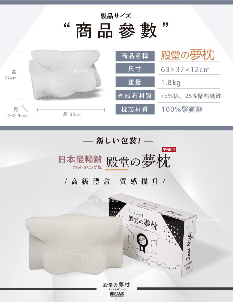商品名稱:日本熱銷-殿堂的夢枕枕芯材質:100%聚氨酯枕套材質:75%棉、25%聚酯纖維商品尺寸:長:63公分 寬:37公分 高:12公分重 量:1.5公斤進口商:茂榕數位科技有限公司地址:桃園市平鎮區廣東路57巷1號電話:0800666865產地:「私藏生活」授權代理※注意! 鑑賞期非試用期,枕頭屬個人衛生用品,如經拆封或使用,概不接受退換貨,購買及使用前請特別留意! 謝謝