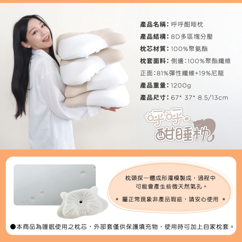 品名:【Pure Sleep】呼呼酣睡枕 下單即贈提袋!產品結構:8D多區塊分壓枕芯材質:100%聚氨酯枕套面料:側邊-100%聚酯纖維/正面-81%彈性纖維+19%尼龍產品尺寸:6638*8-13CM產品重量:1200g產地:中國(台灣監製)代理商:茂榕數位科技有限公司地址:桃園市平鎮區廣東路57巷1號電話:0800-666865※注意! 枕芯屬於個人衛生用品,如經拆封或使用,概不接受退換貨,購買使用前請特別留意!※商品圖片為實物拍攝,由於螢幕顯示色差、拍攝光線等因素,照片與實物可能略有差異,請以實物為準。※尺寸均為人工測量,若誤差在2CM以內純屬合理範圍,完美主義者請謹慎下單,最終請以實體為準。※注意! 以下說明不屬瑕疵範圍:1. 小於1-3cm尺寸測量誤差、些微不對稱2. (1cm極小污點/摺痕/刮痕/螢幕色差等3. 些微脫線/勾針/線頭/味道/五金刮痕4. 人為造成損壞或使用痕跡【退換貨需知】※拆封商品時,為了保障雙方權益,開封時務必錄影留證。※鑑賞期為猶豫期,並非試用期。※提醒您!商品需要全新且包裝完整的情況下,才能辦理退貨退款,避免影響個人權益。