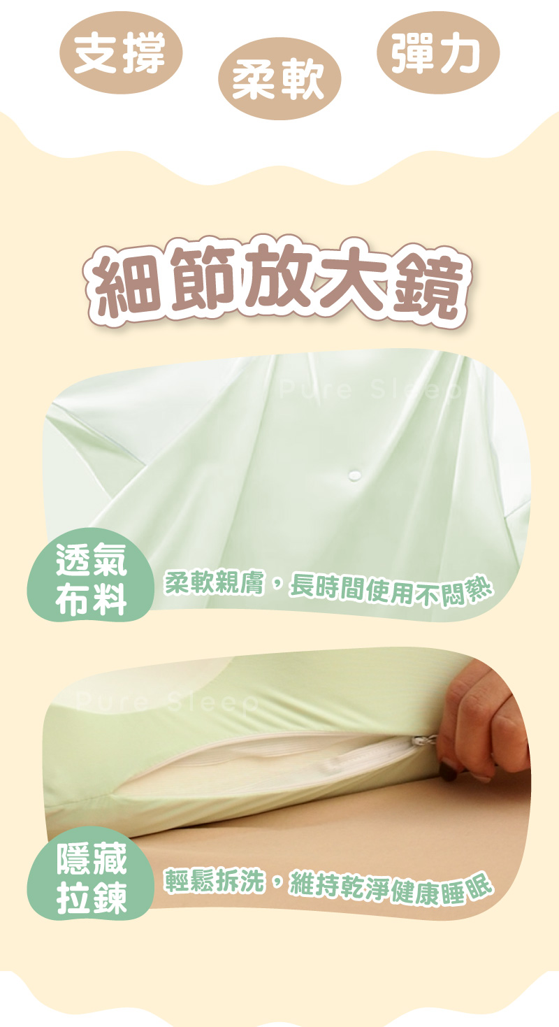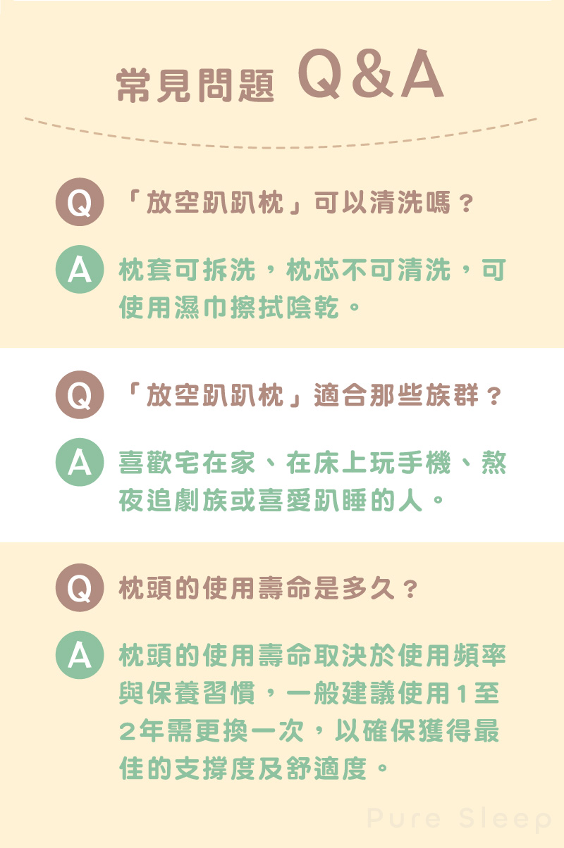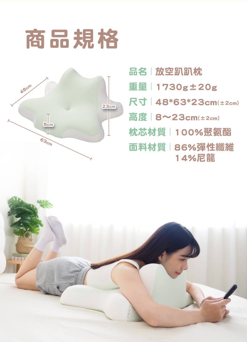 品名:【Pure Sleep 純好眠】放空趴趴枕面料材質:86%彈性纖維+14%尼龍填充物:100%聚氨酯面料尺寸:48*63cm(±2cm)高度:8~23cm(±2cm)產地:中國(台灣監製)進口商:茂榕數位科技有限公司地址:桃園市平鎮區廣東路57巷1號電話:0800-666865【注意事項】※尺寸均為人工測量,若誤差在2CM以內純屬合理範圍,完美主義者請謹慎下單,最終請以實體為準。※商品圖片為實物拍攝,由於螢幕顯示色差、拍攝光線等因素,照片與實物可能略有差異,請以實物為準。※注意! 以下說明不屬瑕疵範圍:1. 小於1-3cm尺寸測量誤差、些微不對稱2. (1cm極小污點/摺痕/刮痕/螢幕色差等3. 些微脫線/勾針/線頭/味道/五金刮痕4. 人為造成損壞或使用痕跡【退換貨需知】※拆封商品時,為了保障雙方權益,開封時務必錄影留證。※鑑賞期為猶豫期,並非試用期。※提醒您!枕芯屬於個人衛生用品,商品需要全新且包裝完整的情況下,才能辦理退貨退款,一旦經拆封或使用,已毀損商品價值,概不接受退換貨,購買使用前須特別留意,避免影響自身權益!