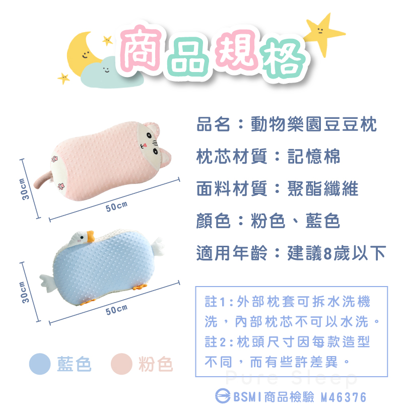 品名:【Pure Sleep 純好眠】動物樂園豆豆枕面料材質:聚酯纖維填充物:記憶棉款式:藍貓/粉貓/藍鵝/粉鵝尺寸:50*30cm(±2cm)產地:中國(台灣監製)進口商:茂榕數位科技有限公司地址:桃園市平鎮區廣東路57巷1號電話:0800-666865※尺寸均為人工測量,若誤差在2CM以內純屬合理範圍,完美主義者請謹慎下單,最終請以實體為準。※商品圖片為實物拍攝,由於螢幕顯示色差、拍攝光線等因素,照片與實物可能略有差異,請以實物為準。※商品尺寸為人工測量,標示僅供參考,若有誤差,請以實物為準。※注意! 枕芯屬於個人衛生用品,經拆封或使用,除瑕疵商品,概不接受退換貨,購買使用前請特別留意!※注意! 以下說明不屬瑕疵範圍:1. 小於1-3cm尺寸測量誤差、些微不對稱2. (1cm極小污點/摺痕/刮痕/螢幕色差等3. 些微脫線/勾針/線頭/味道/五金刮痕4. 人為造成損壞或使用痕跡【退換貨需知】※拆封商品時,為了保障雙方權益,開封時務必錄影留證。※鑑賞期為猶豫期,並非試用期。※提醒您!商品需要全新且包裝完整的情況下,才能辦理退貨退款,避免影響個人權益。