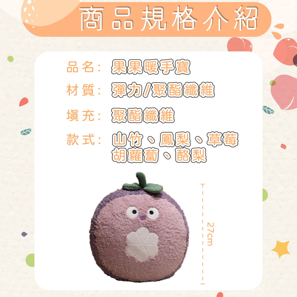 品名:【Pure Sleep】果果暖手寶材質:彈力/聚酯纖維填充:聚酯纖維尺寸:27cm款式:山竹/酪梨/蘿蔔/草莓/鳳梨產地:中國進口商:茂榕數位科技有限公司地址:桃園市平鎮區廣東路57巷1號電話:0800-666865※商品圖片為實物拍攝,由於螢幕顯示色差、拍攝光線等因素,照片與實物可能略有差異,請以實物為準。※商品尺寸為人工測量,標示僅供參考,若有誤差,請以實物為準。【退換貨需知】※拆封商品時,為了保障雙方權益,開封時務必錄影留證。※鑑賞期為猶豫期,並非試用期。※提醒您!商品需要全新且包裝完整的情況下,才能辦理退貨退款。