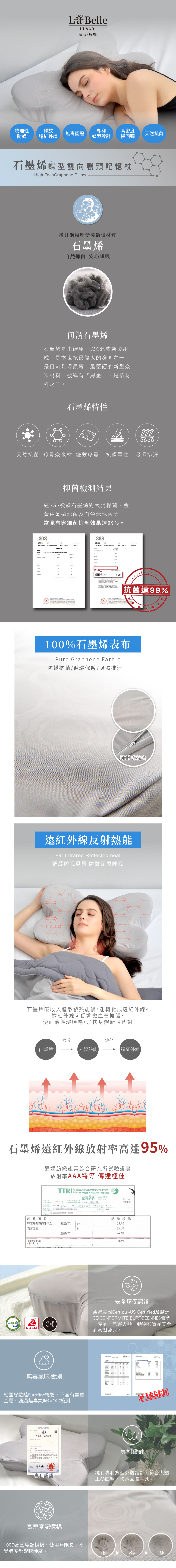 ◆產品內容/材質:.內容:義大利La Belle《石墨烯蝶型雙向護頸記憶枕》.表布:100%聚酯纖維(石墨烯遠紅外線纖維紗).內裏物:100%聚酯纖維.內容物:100%聚氨酯泡棉.尺寸:60x39x12/10cm.枕芯產地:中國(台商監製).枕套產地:台灣