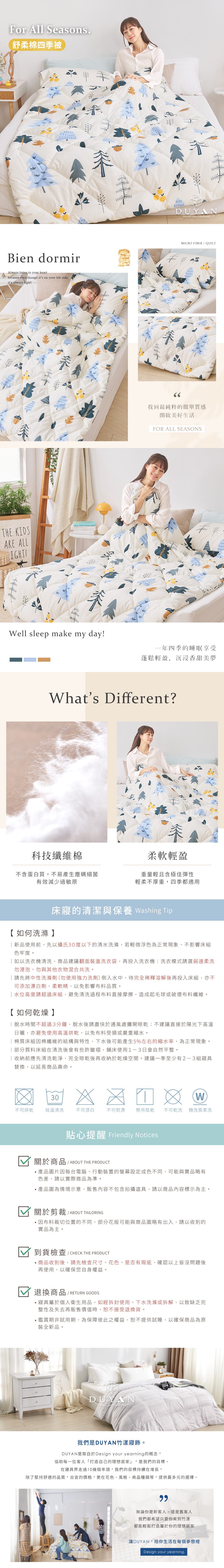 ◇商品特色◇精選四季被,伴你好入眠觸感輕柔,吸濕排汗精密剪裁專業車工四季皆宜,台灣製造◇商品規格◇▪ 內容物:舒柔棉四季被x1▪ 表布:100%聚酯纖維▪ 填充物:100%聚酯纖維▪ 尺寸:135x195公分(±5%)▪ 重量:1.3kg(±3%)▪ 產地:台灣