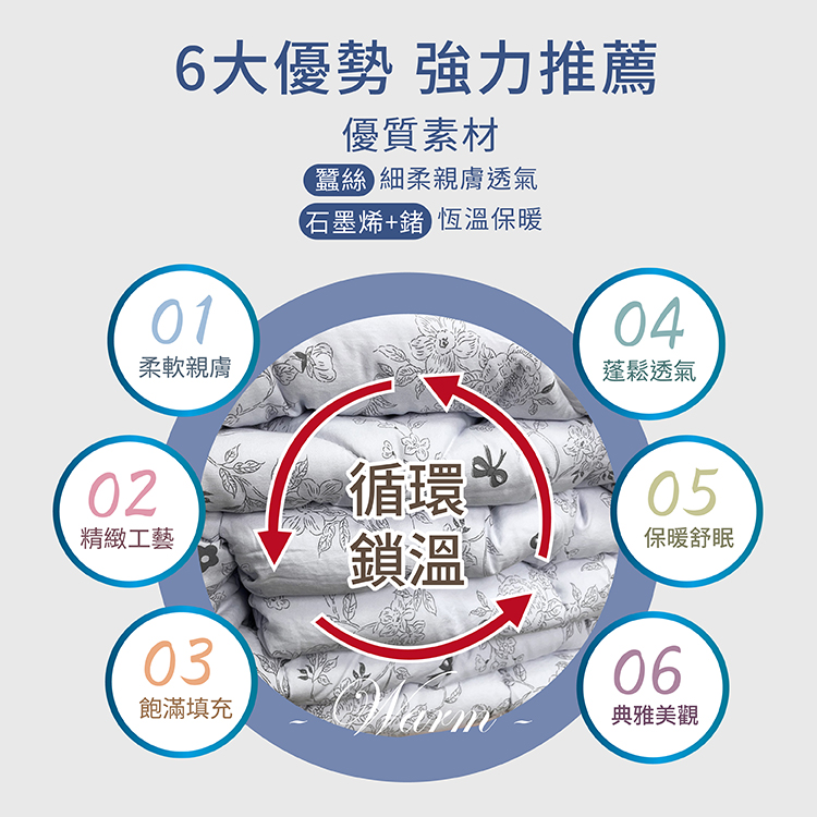 ★石墨烯科技‧睡眠新體驗★釋放遠紅外線,迅速達到最適恆溫★添加蠶絲柔軟親膚保暖,吸濕透氣排汗,乾爽舒適★絕佳手感滑順細緻,舒適透氣防菌抗敏★秋冬禦寒保暖商品