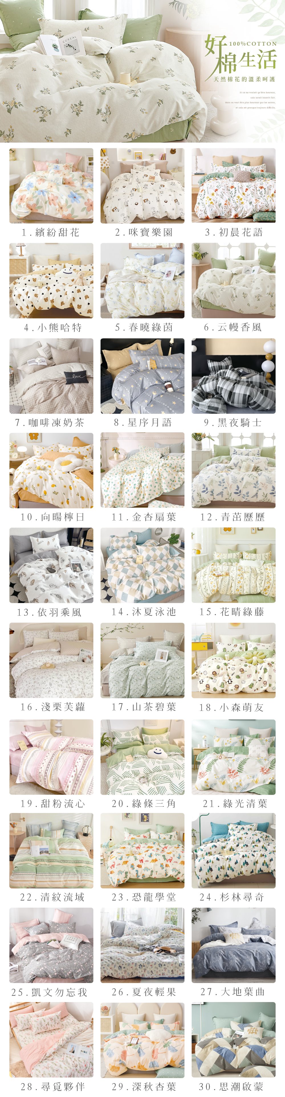 ⭐商品說明⭐▪ 材質: 100%純棉▪ 產地:台灣製造(MIT)▪ 床包:採用全包覆式鬆緊帶,可防止床包滑動▪ 枕套:美式信封枕套▪ 被套:有四角綁繩▪ 床包包覆高度:28cm±5%⭐尺寸說明⭐🎀單人床包二件組1. 單人薄床包(105*186cm) x1 2. 信封式枕套(45*75cm±5%) x1🎀單人床包被套三件組 1.單人薄床包(105*186cm) x12.單人薄被套(135*195 cm) x13.信封式枕套(45*75cm±5%) x1🎀雙人床包三件組 1.雙人薄床包(150*186cm) x12.信封式枕套(45*75cm±5%) x2🎀雙人床包被套四件組 1.雙人薄床包(150*186cm) x12.雙人薄被套(180*210cm) x1 3.信封式枕套(45*75cm±5%) x2🎀雙人加大床包三件組 1.雙人加大薄床包(180*186cm) x1 2.信封式枕套(45*75cm±5%) x2🎀雙人加大床包被套四件組 1.雙人加大薄床包(180*186cm) x1 2.雙人薄被套(180*210cm) x1 3.信封式枕套(45*75cm±5%) x2🎀純棉雙人四件式舖棉兩用被床包組 1.雙人薄床包(150×186公分) x1 2.舖棉兩用被套(180×210公分) x1 3.信封式枕套(45*75cm±5%) x2🎀雙人加大四件式鋪棉兩用被床包組 1.雙人加大薄床包(180*186cm) x1 2.舖棉兩用被套(180×210公分) x1 3.信封式枕套(45*75cm±5%) x2⚠️注意事項⚠️.因布料裁切位置的不同,部份花版可能會與商品圖略有出入,請以收到的實品為主。.個人衛生用品,如經拆封使用、下水洗滌或拆解以致缺乏完整性及失去再販售價值時,恕不接受退換貨。搜尋【duyan_bedding】可看到更多商品