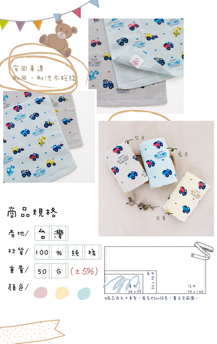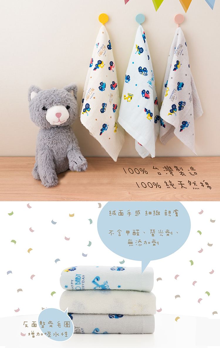 臺灣製造品質安心,100%純棉材質觸感柔細低棉絮,超可愛動物圖案,不論是大人還是小寶貝都可以使用,使用起來超細緻,輕薄快乾溫和去除污垢。