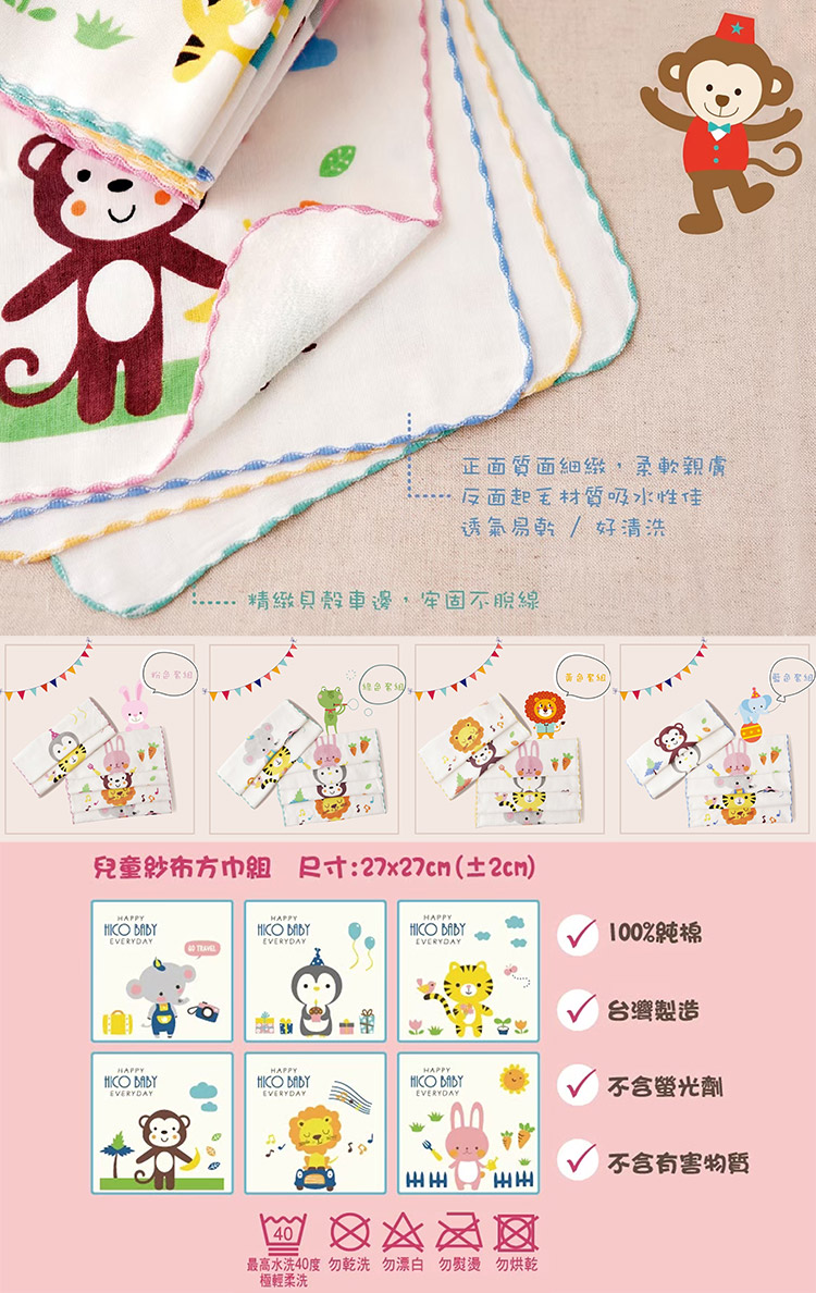 臺灣製造品質安心,100%純棉材質觸感柔細低棉絮,超可愛動物圖案,不論是大人還是小寶貝都可以使用,使用起來超細緻,輕薄快乾溫和去除污垢。