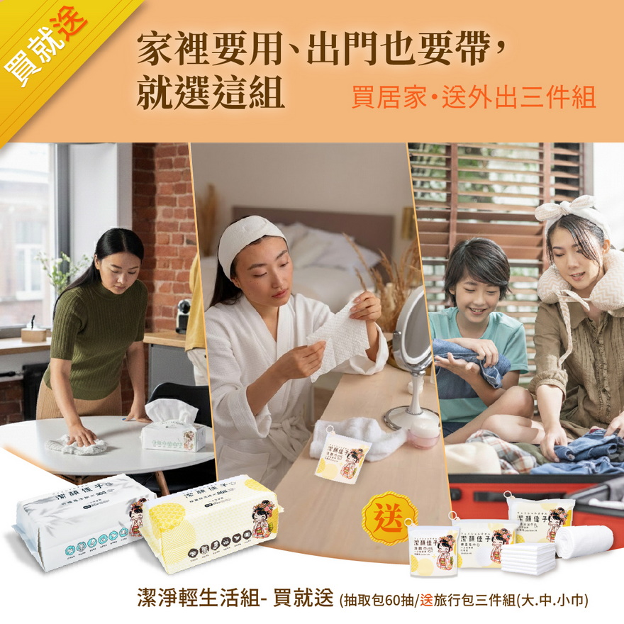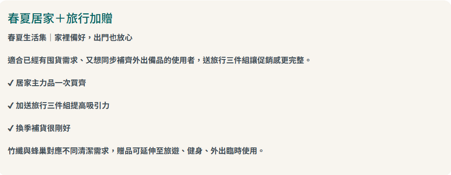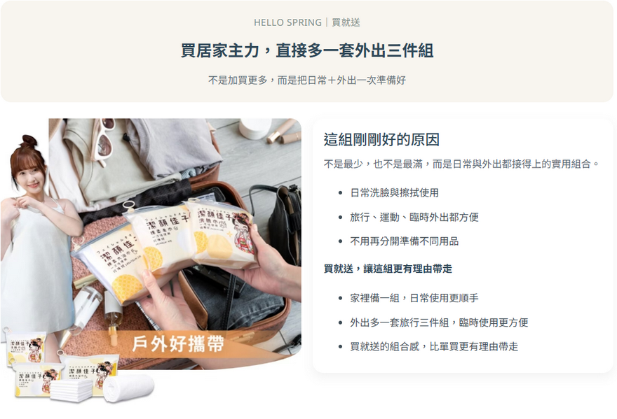 居家日常最常用的竹纖與蜂巢一次補齊,再加送旅行三件組,讓清潔不只在家裡,也能一路跟著你出門。春季買就送,從室內到戶外都更完整。