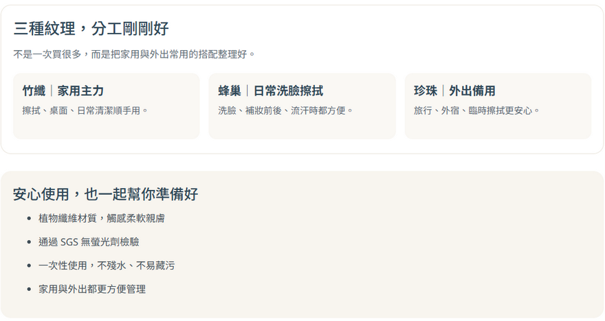 一組把全家所有情境都準備好。竹纖×2(家用清潔)+蜂巢×2(臉部潔淨)+送旅行三件組 (外出/運動) 乾濕兩用、不易破、不掉絮,一組搞定日常最常用的潔淨需求。