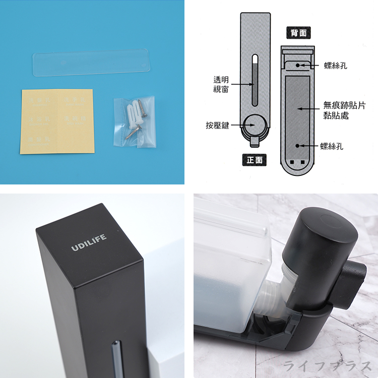 讓你的浴室更整齊,不需要觸碰,只需按壓,可以使用洗髮精、沐浴乳、洗手乳、洗碗精等各種補充液,內附無痕貼片,黏貼性強不殘膠不傷牆面,免釘免鑽孔簡單組裝,可隨意黏貼瓷磚、大理石、木板、塑膠、金屬方便實用,不平整牆面可以螺絲安裝固定,簡約時尚的設計,讓你的浴室煥然一新。